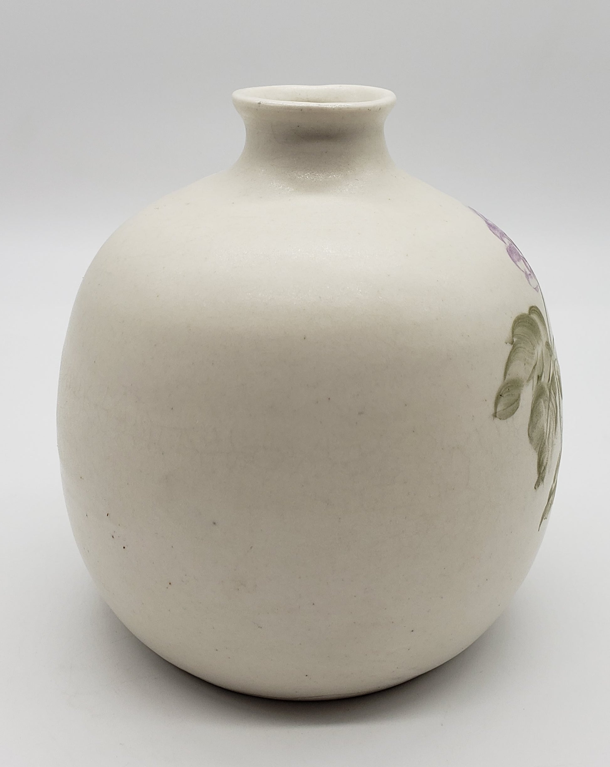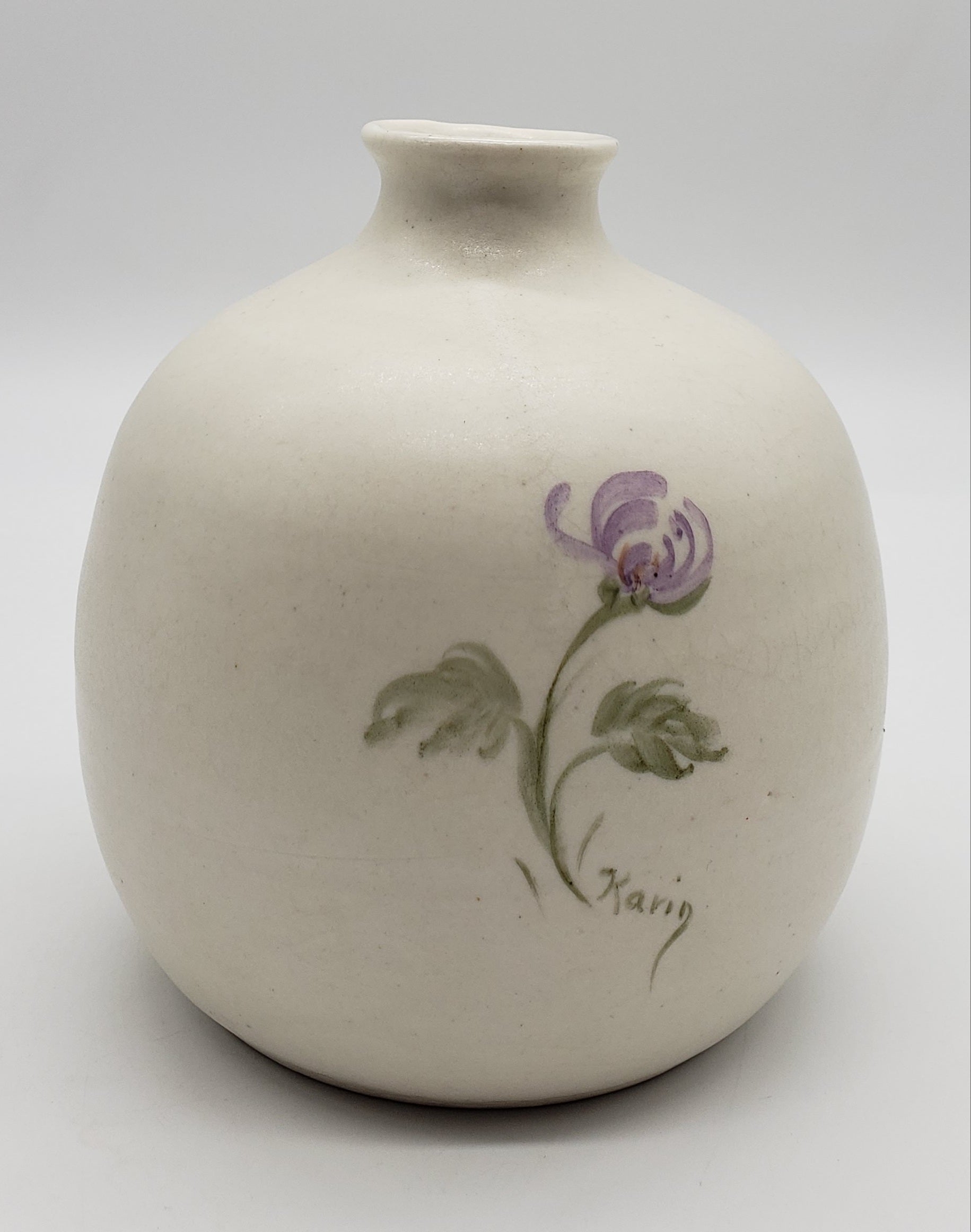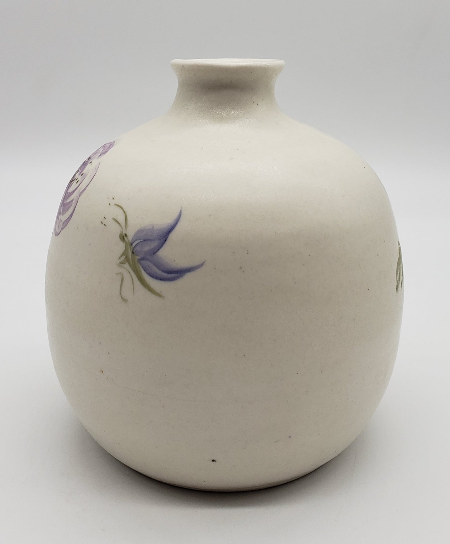Signed Studio Pottery vase with hand painted purple flower and butterfly