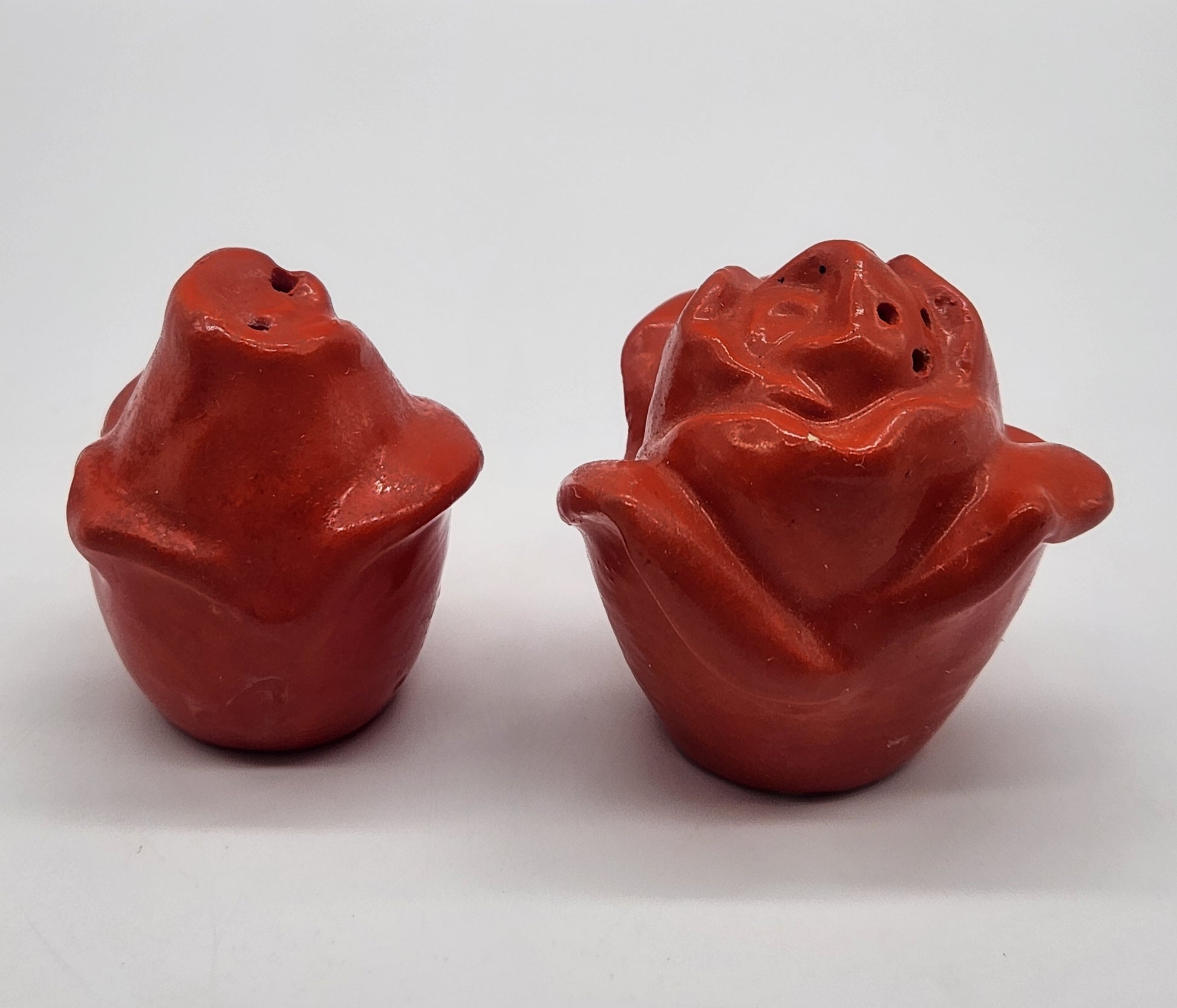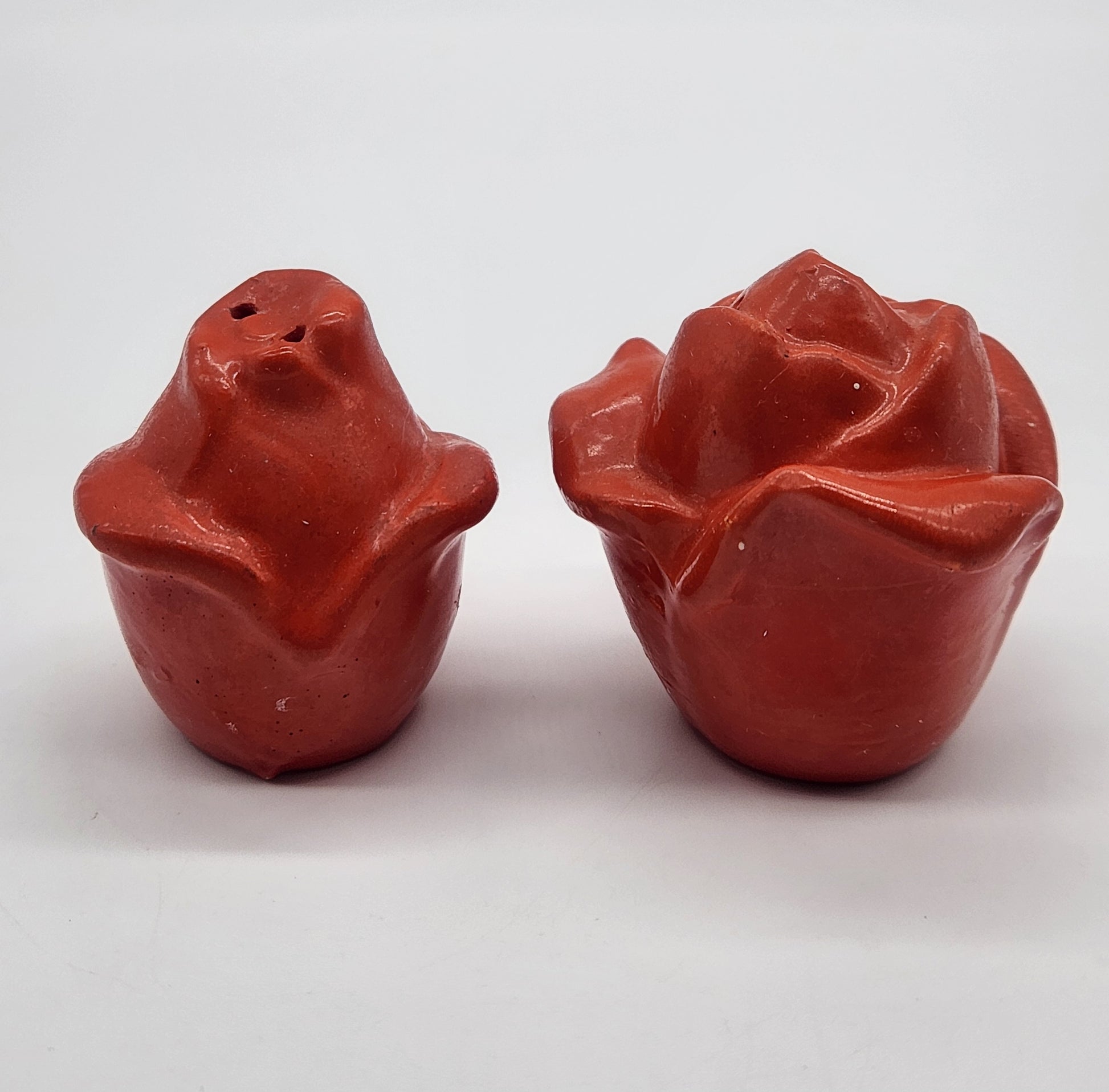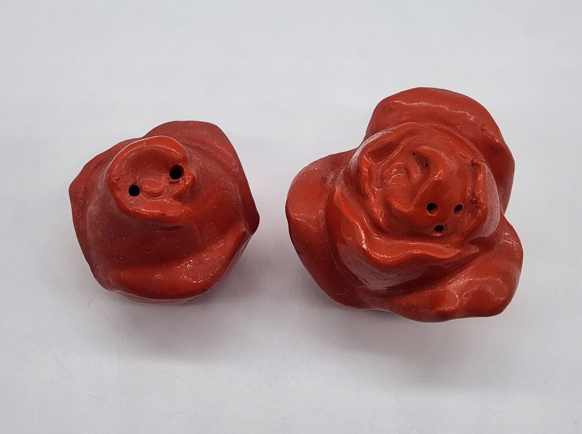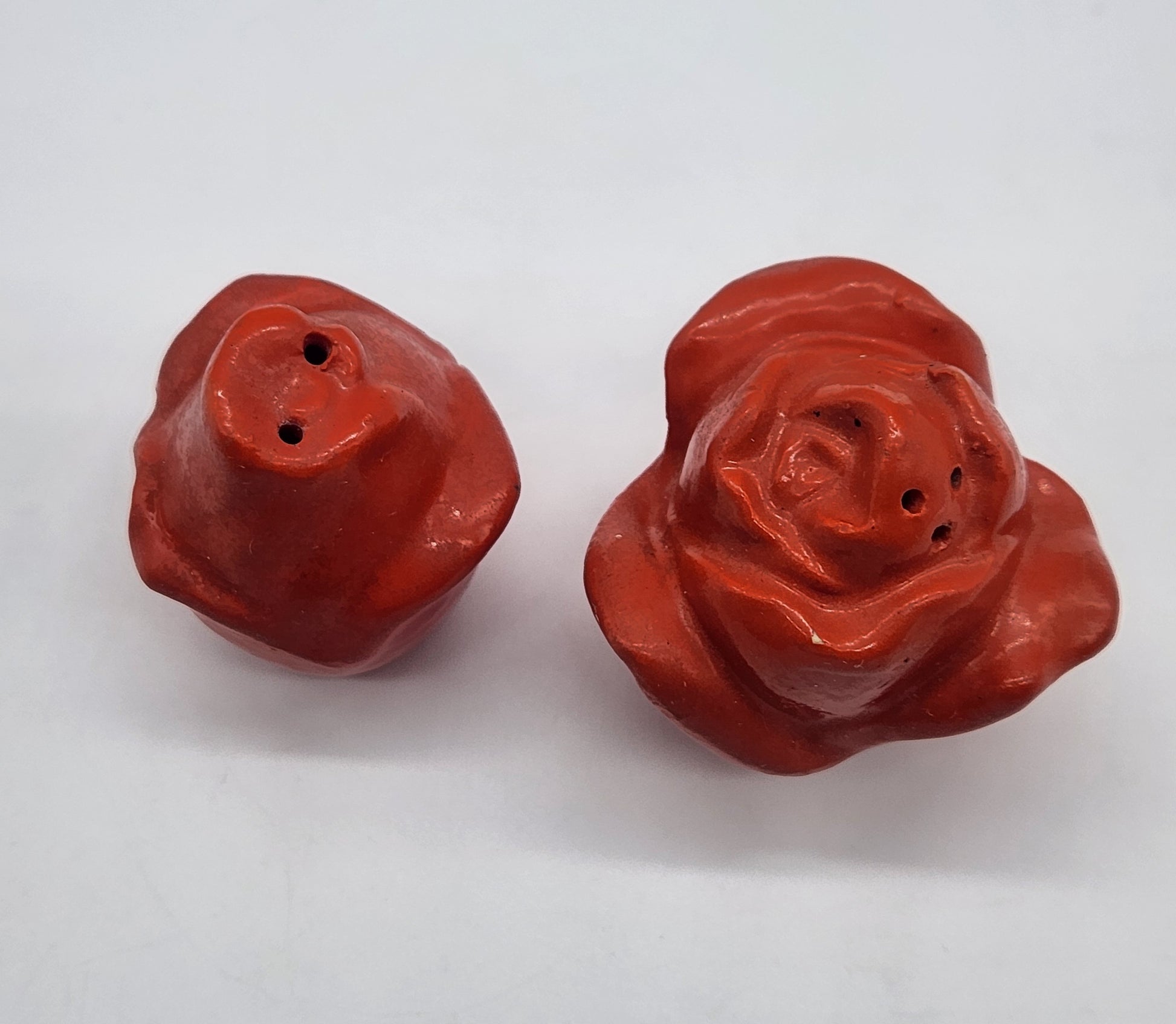 Red Rose Salt & Pepper Shakers Made in Japan. 1.75" tall x 1.25 wide. Corks have been pushed inside shakers.