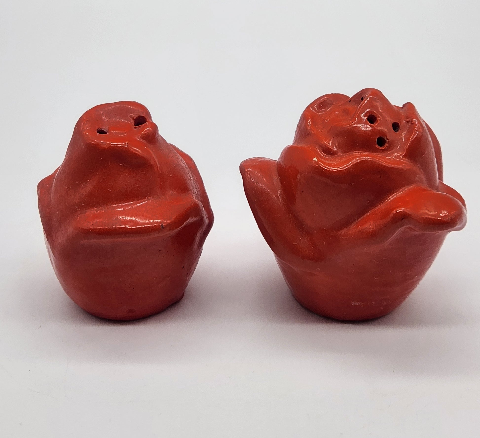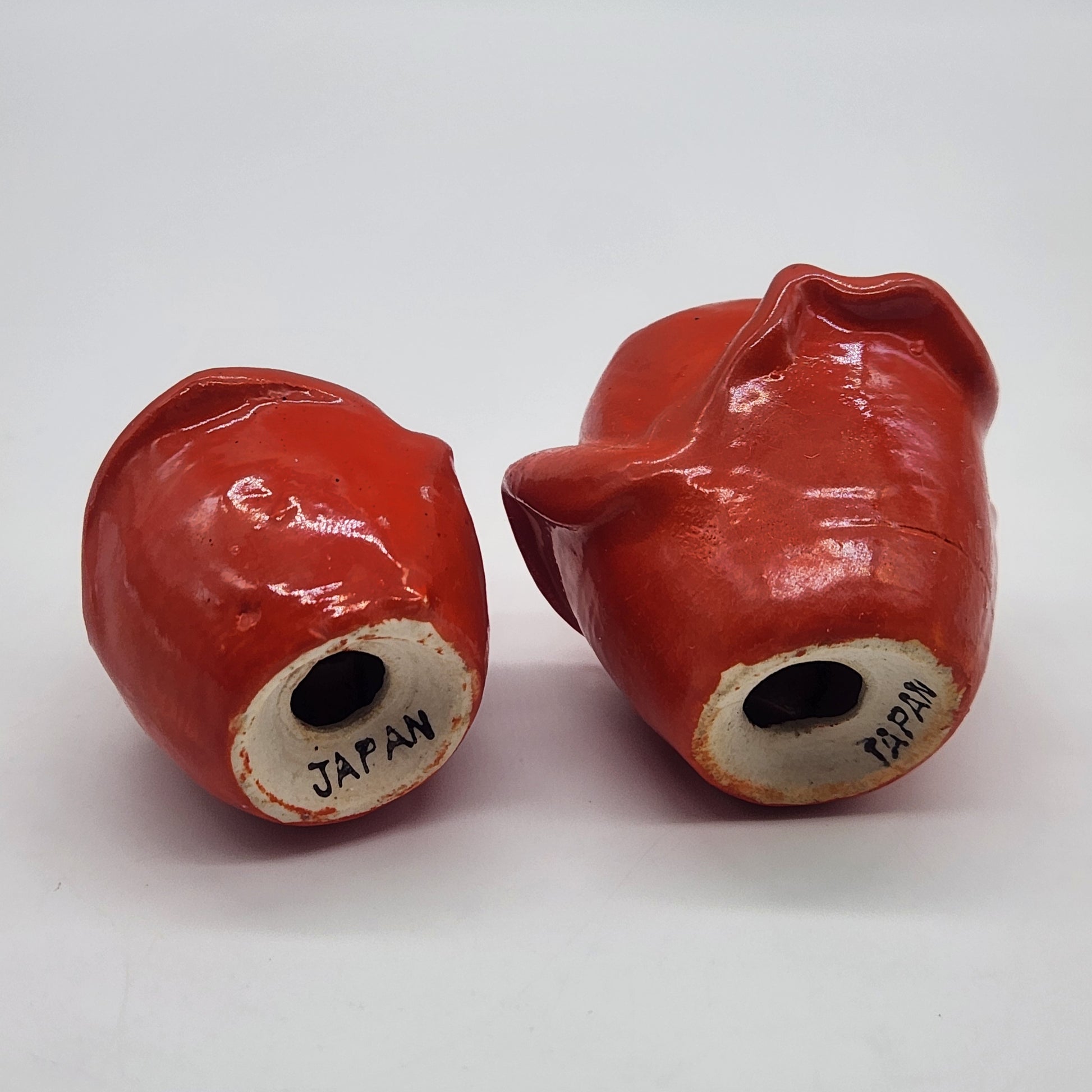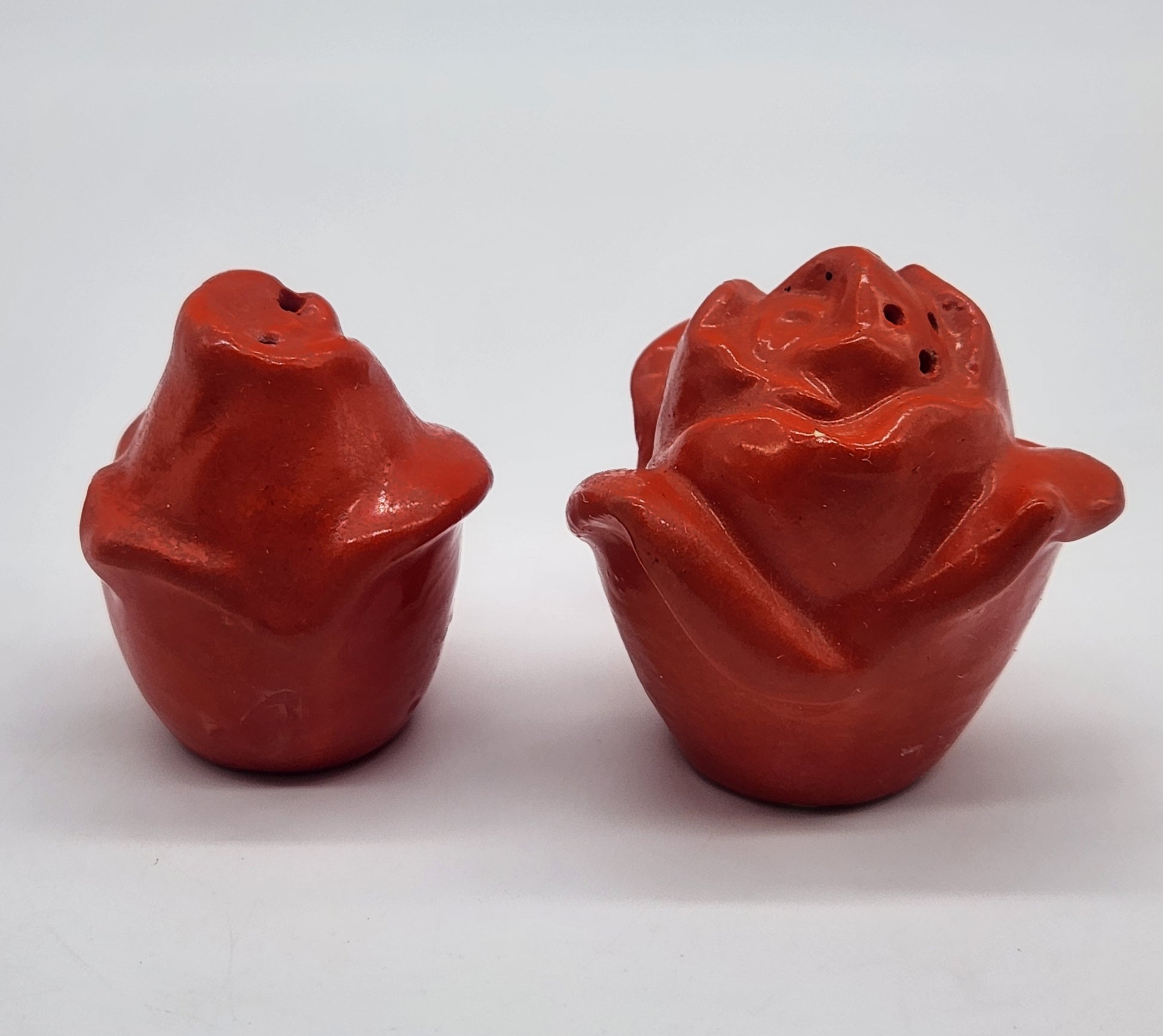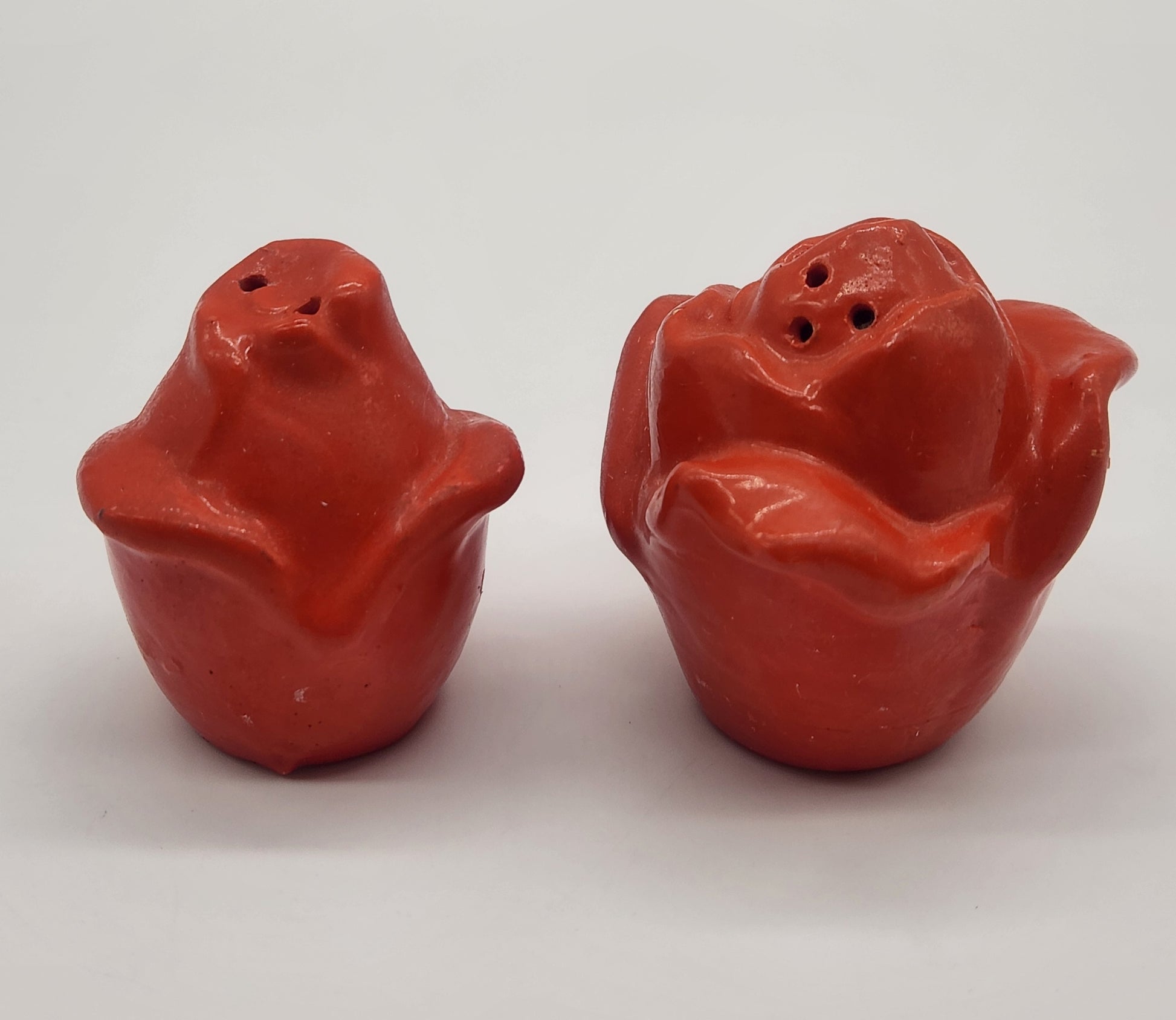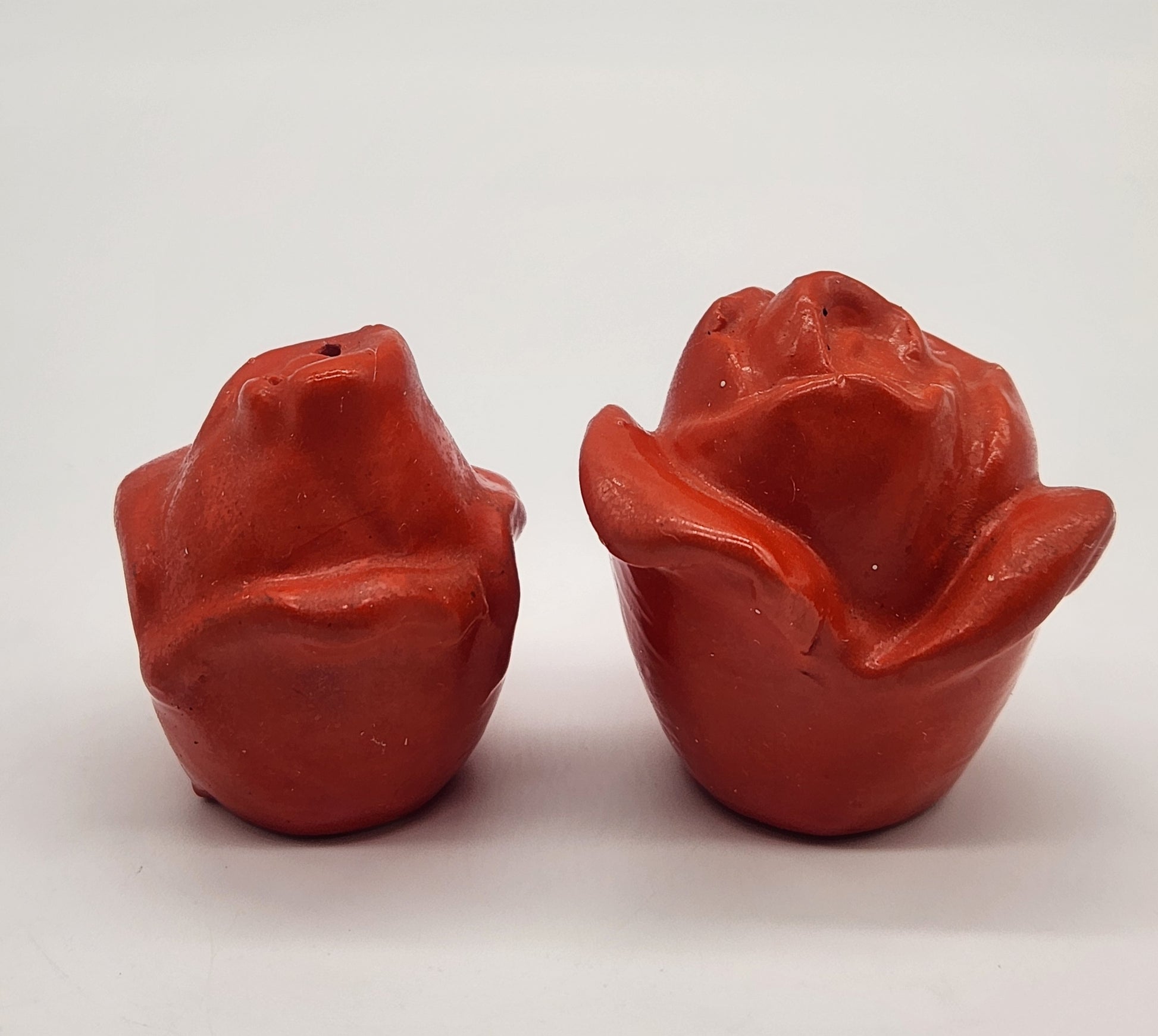 Red Rose Salt & Pepper Shakers Made in Japan. 1.75" tall x 1.25 wide. Corks have been pushed inside shakers.