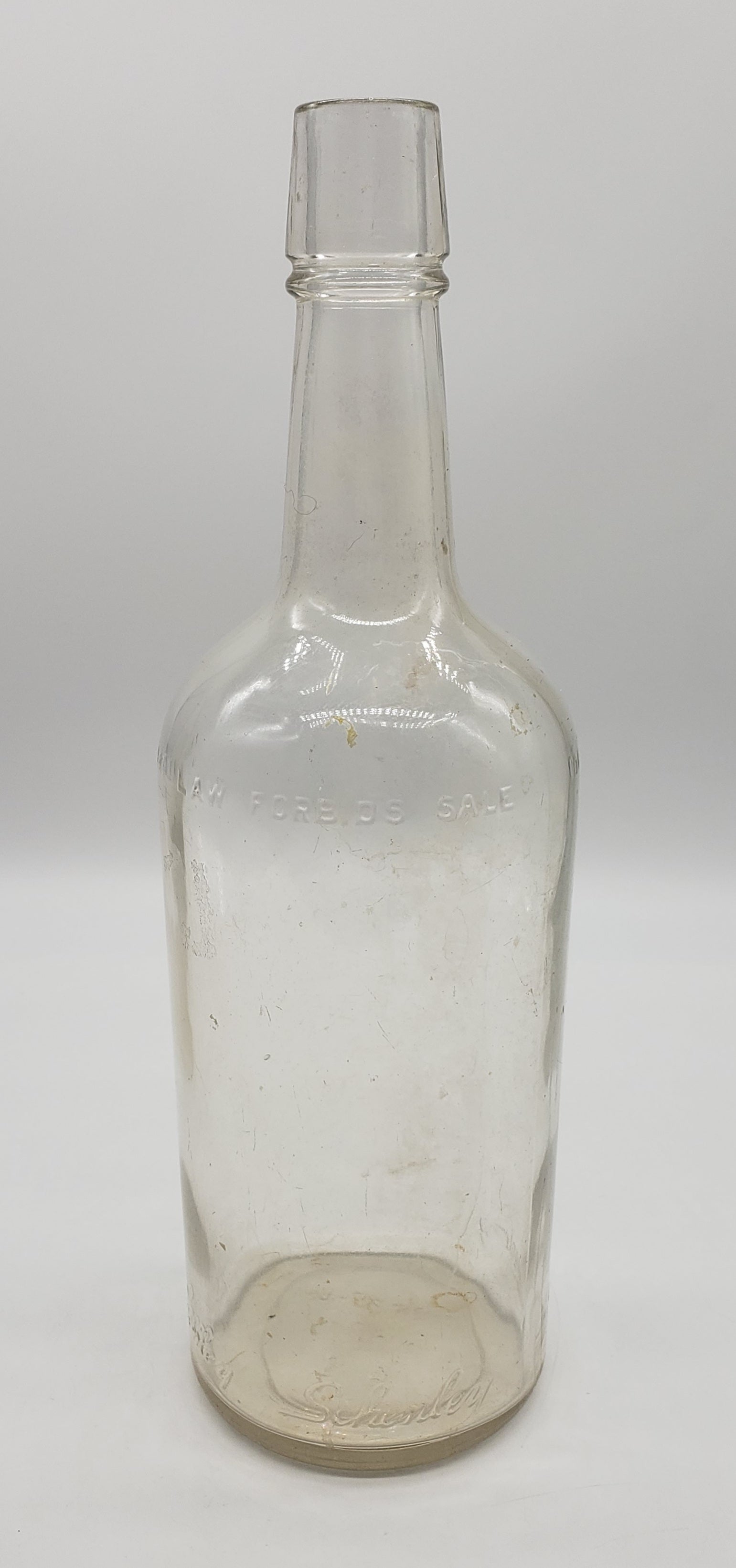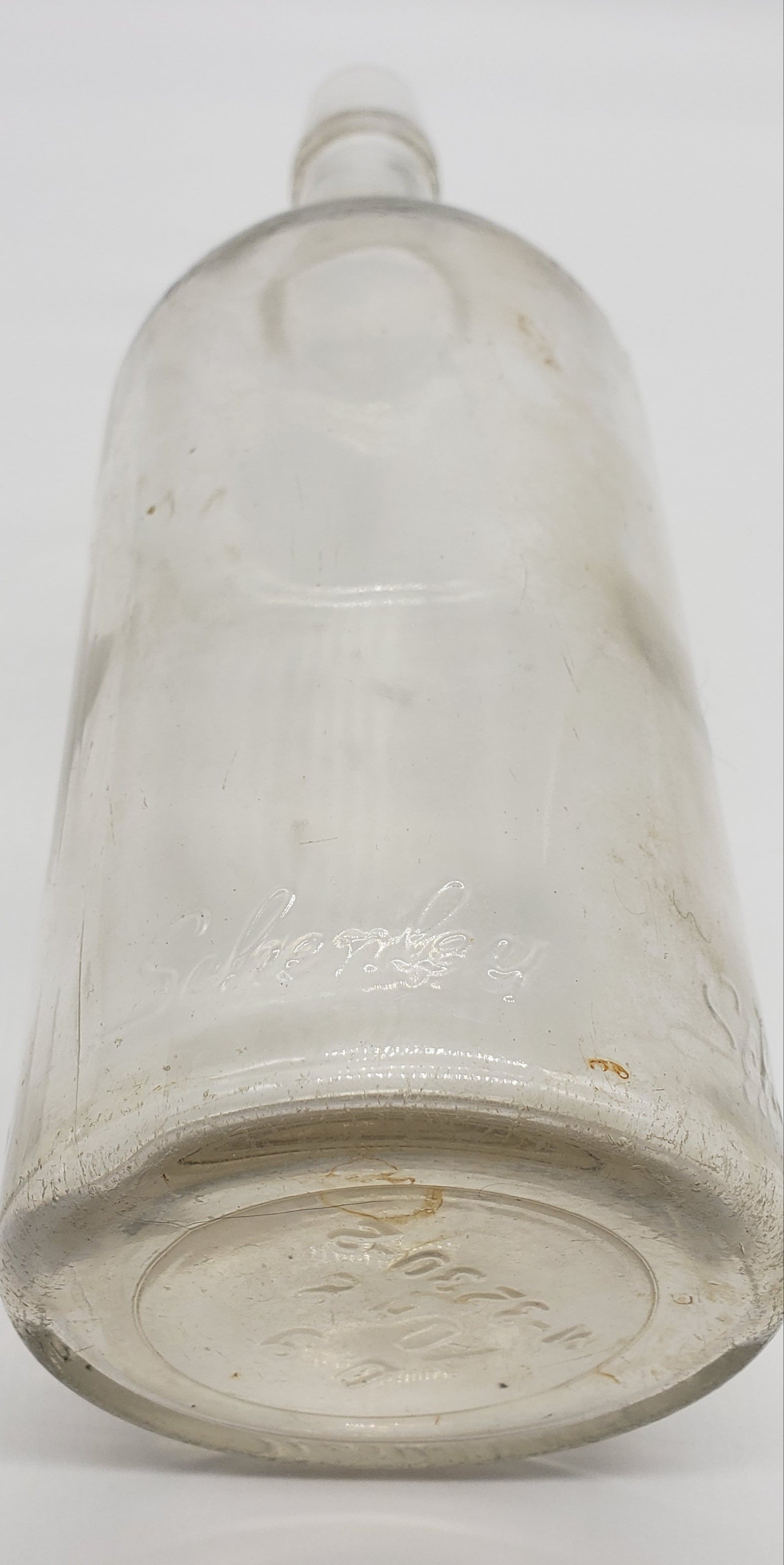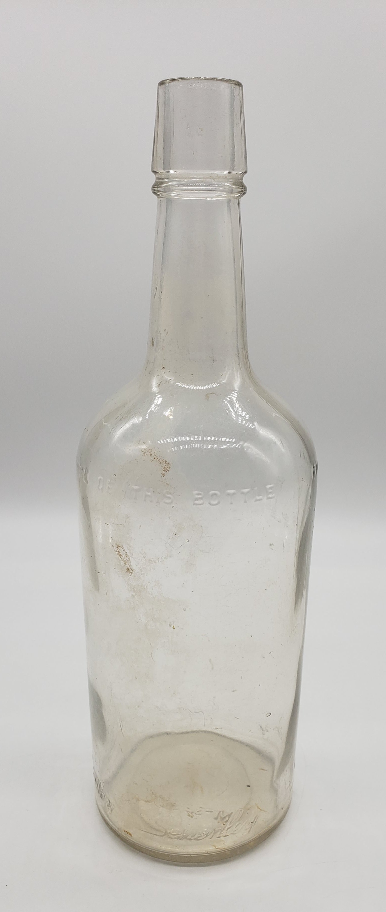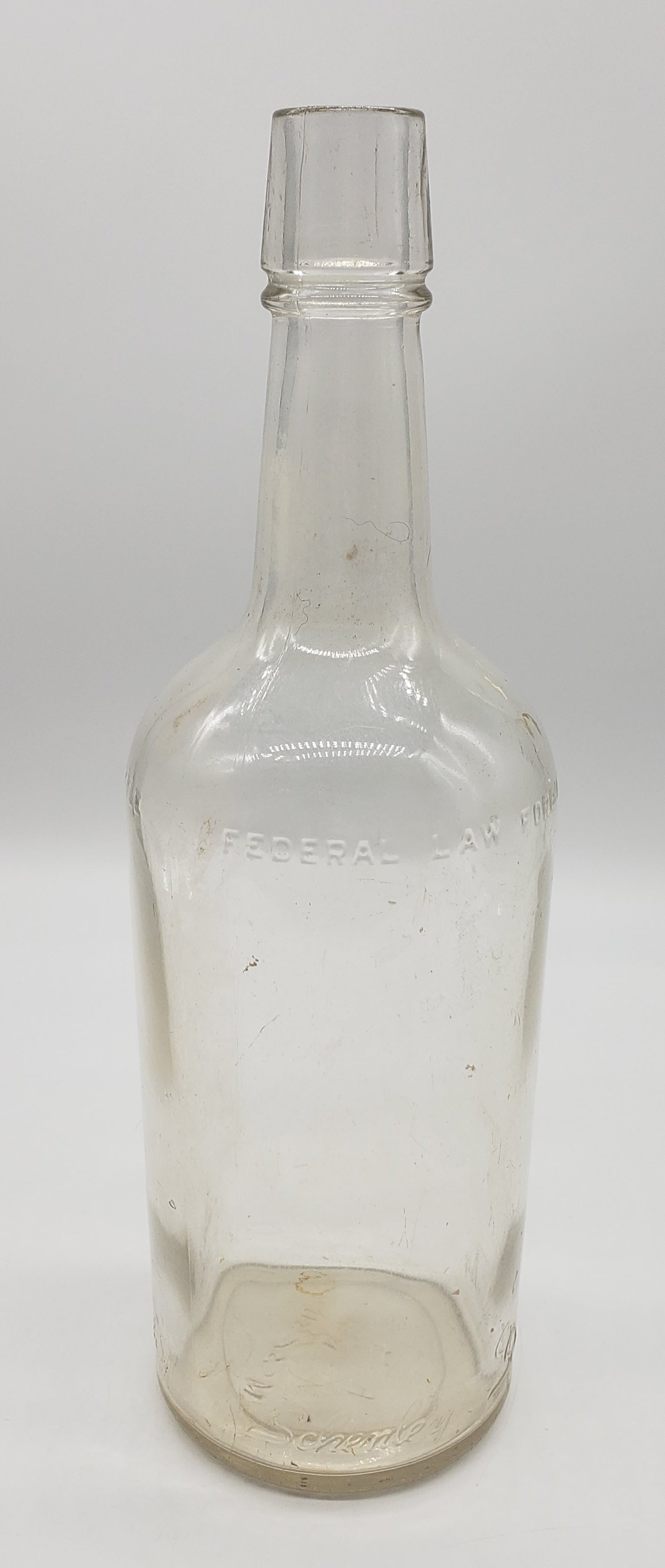 This is a vintage, Schenley bottle embossed below the neck, "Federal Law Forbids Sale or Re-Use of this Bottle" while "Schenley" is embossed around the base. The bottom of the vintage bottle is embossed with the Anchor Hocking mark in the middle with "D9" above, "70" to the left, "8" to the right" and "M-3230-2" below. The numbers represent plant and model codes .