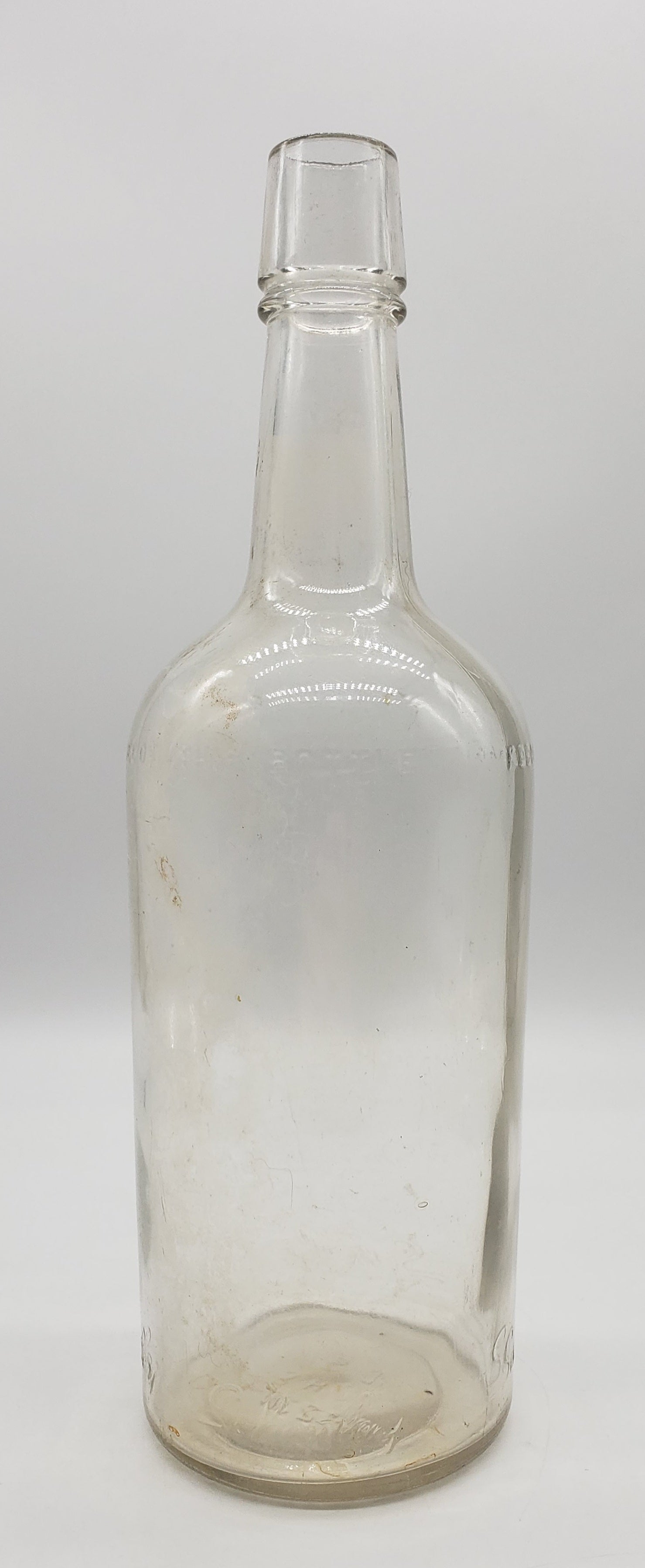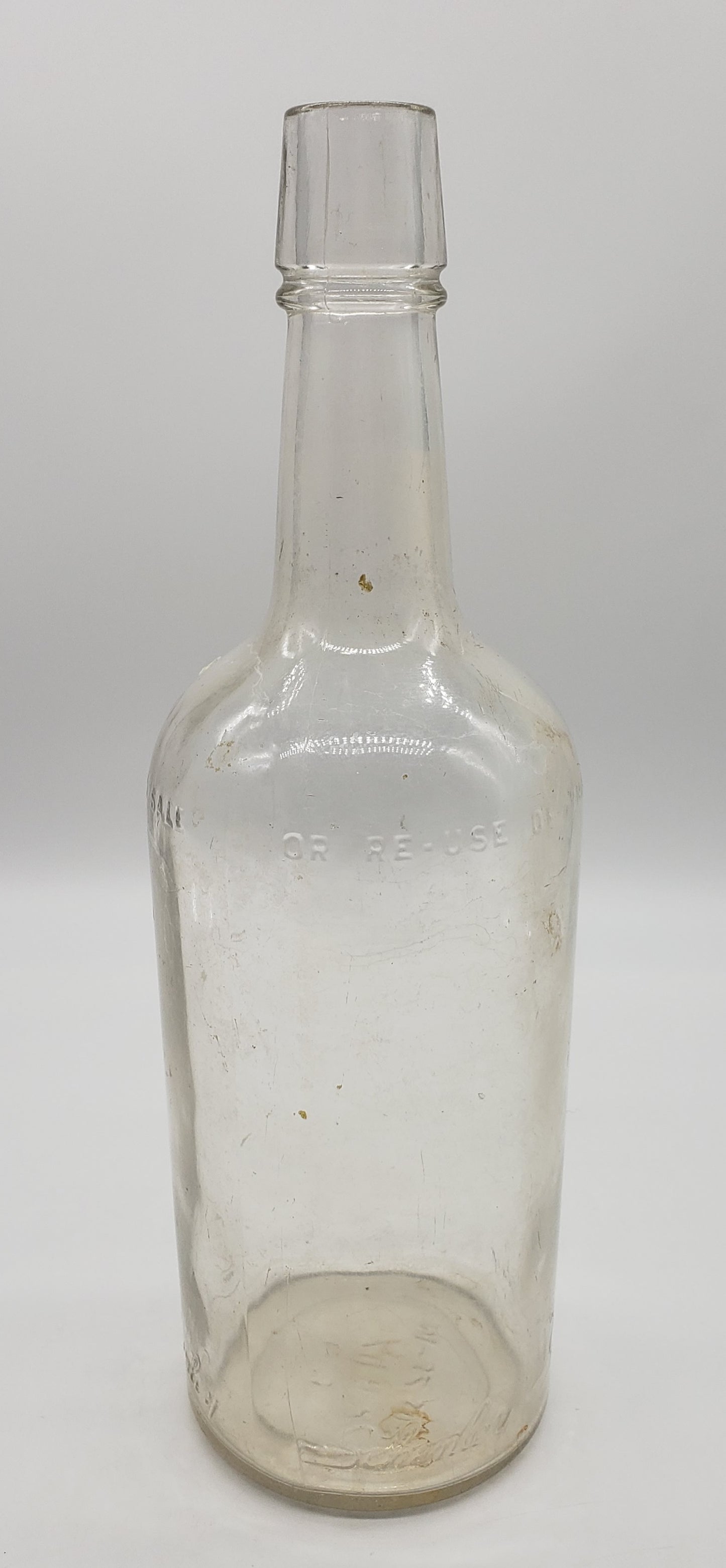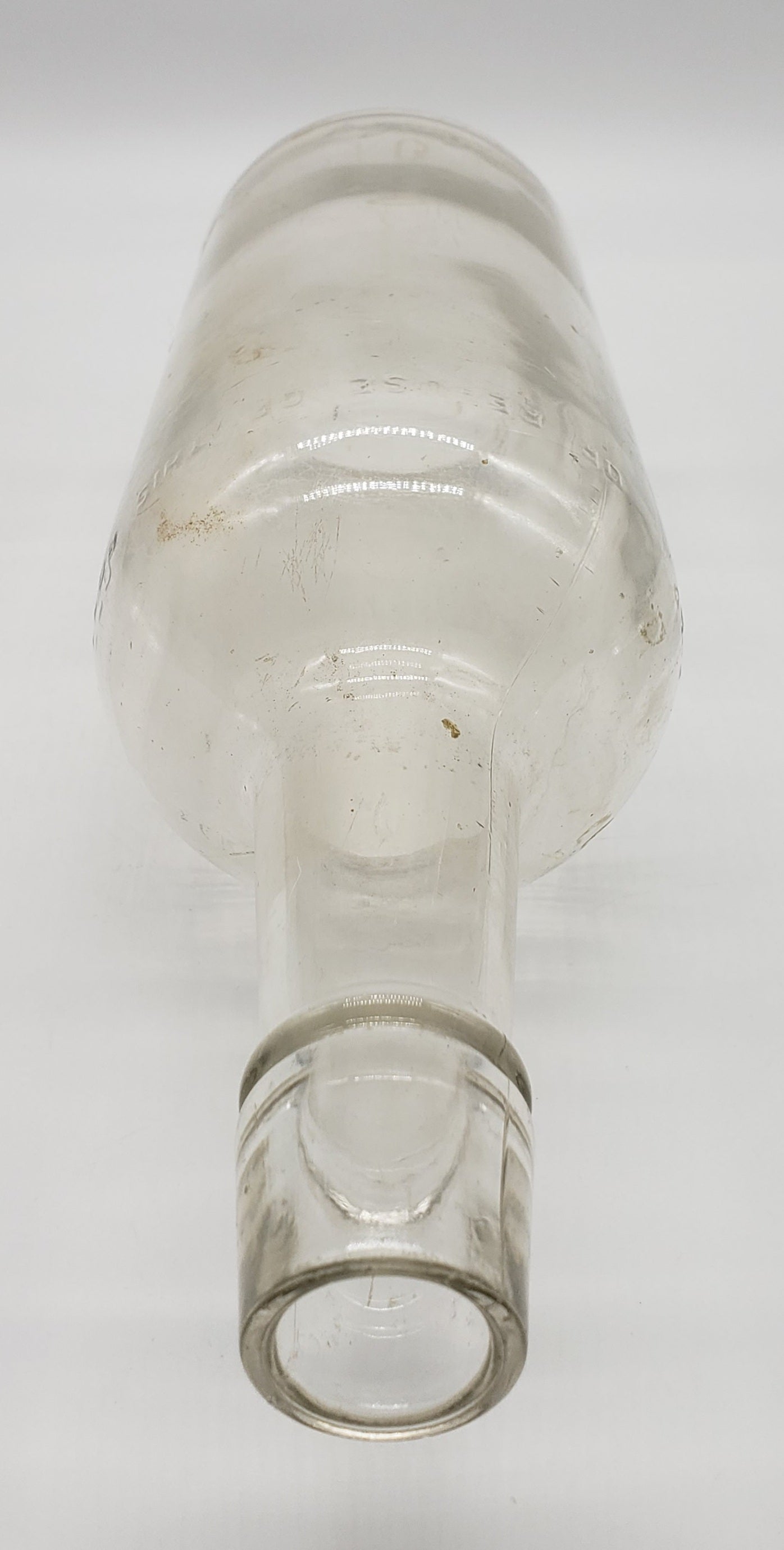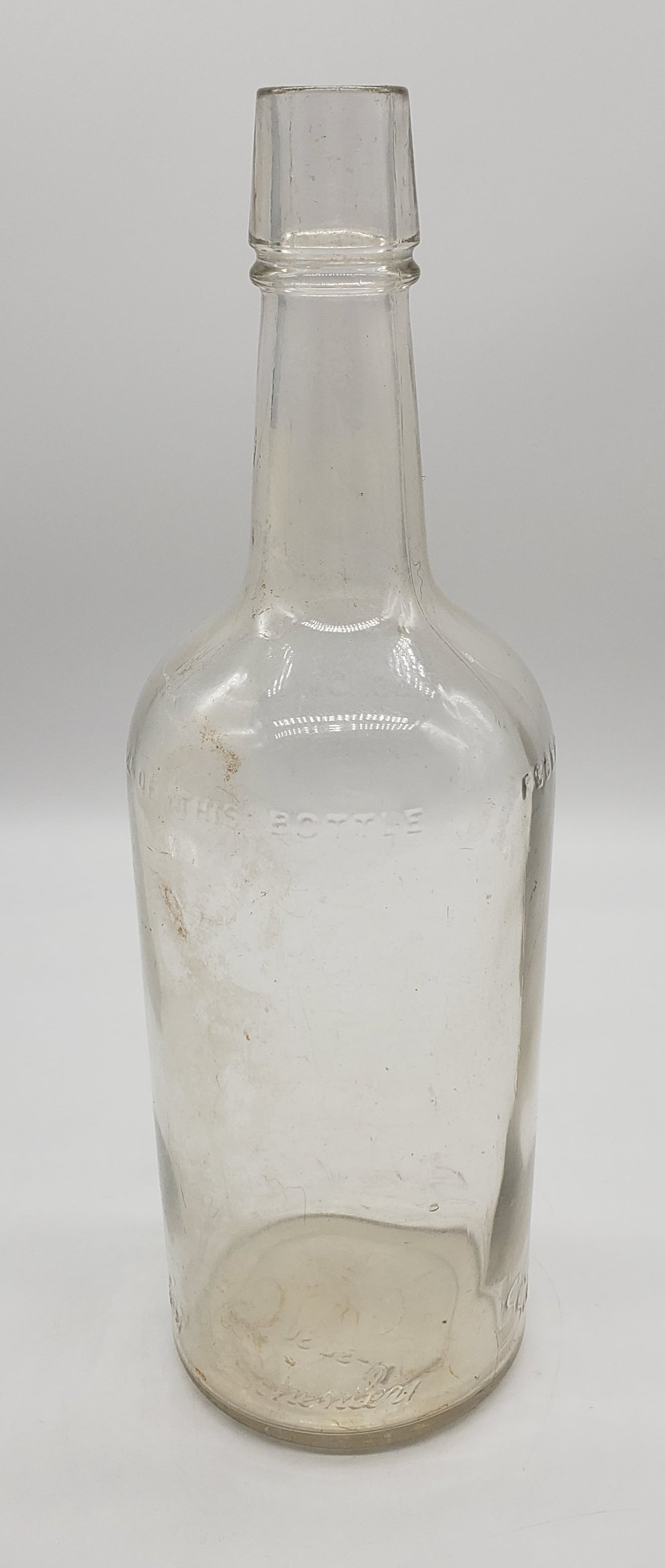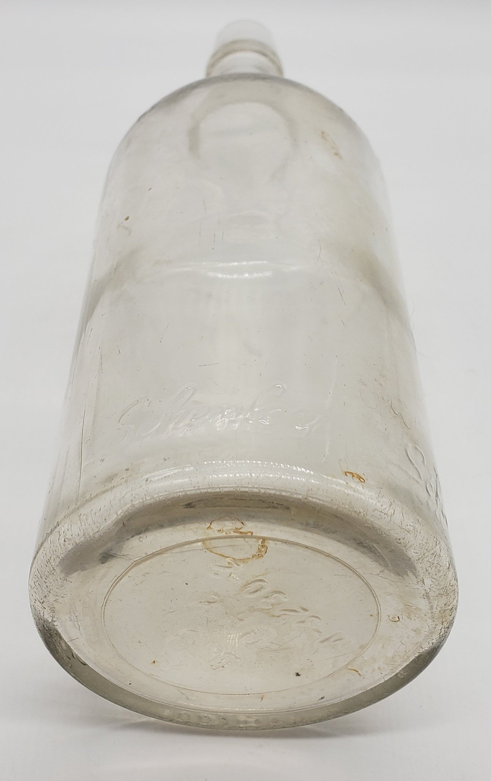 This is a vintage, Schenley bottle embossed below the neck, "Federal Law Forbids Sale or Re-Use of this Bottle" while "Schenley" is embossed around the base. The bottom of the vintage bottle is embossed with the Anchor Hocking mark in the middle with "D9" above, "70" to the left, "8" to the right" and "M-3230-2" below. The numbers represent plant and model codes .