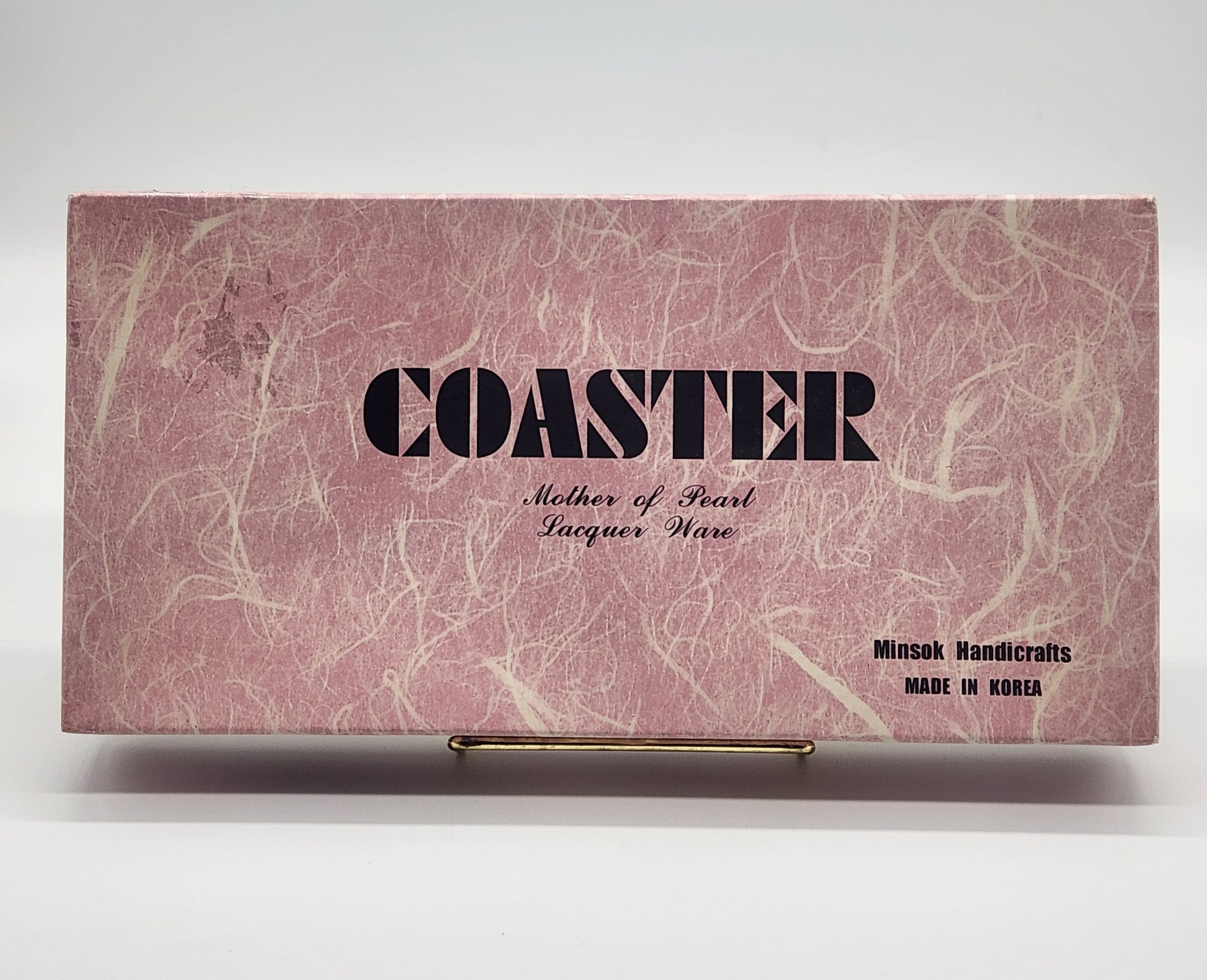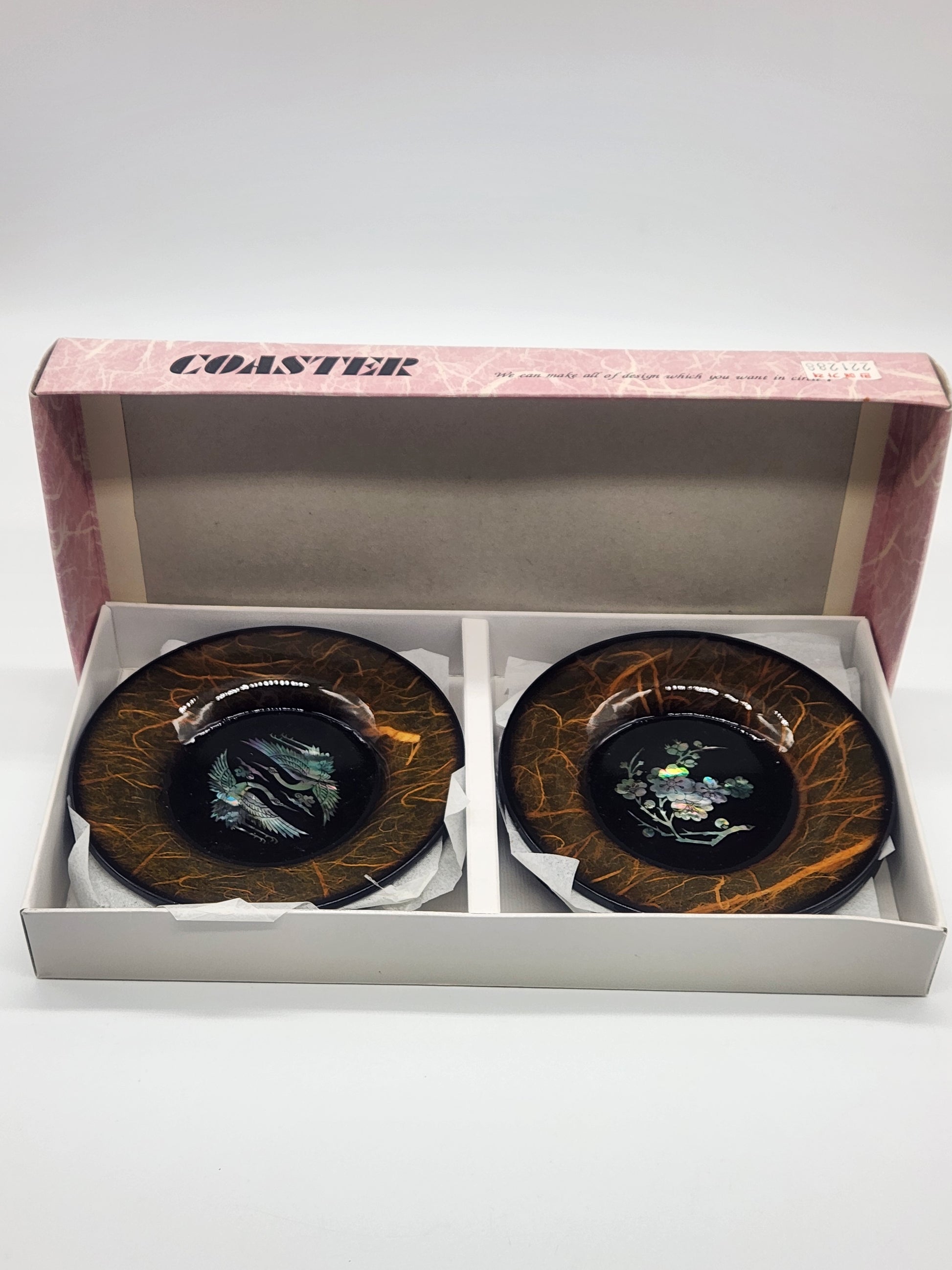 Set Of 6 Laquer Ware Inlaid Mother of Pearl Cherry Blossom Coasters w/box. One coaster features a crane while other 5 are floral.
