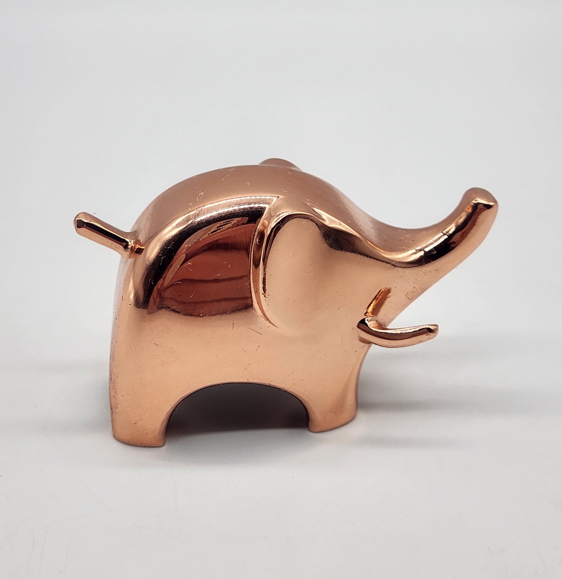 Anigram is a decorative and whimsical ring holder, structured to replicate the shape of an elephant. With a cast metal construction and a shiny metallic finish, this ring holder is sturdy and sleek. Measuring 2.75" x 1" x 1.75"), Anigram is petite, while still able to store multiple rings of any size. Its simple design ensures it can complement many interior spaces seamlessly, integrating into existing décor. Place Anigram at your bedside, in the kitchen, or on a bathroom countertop