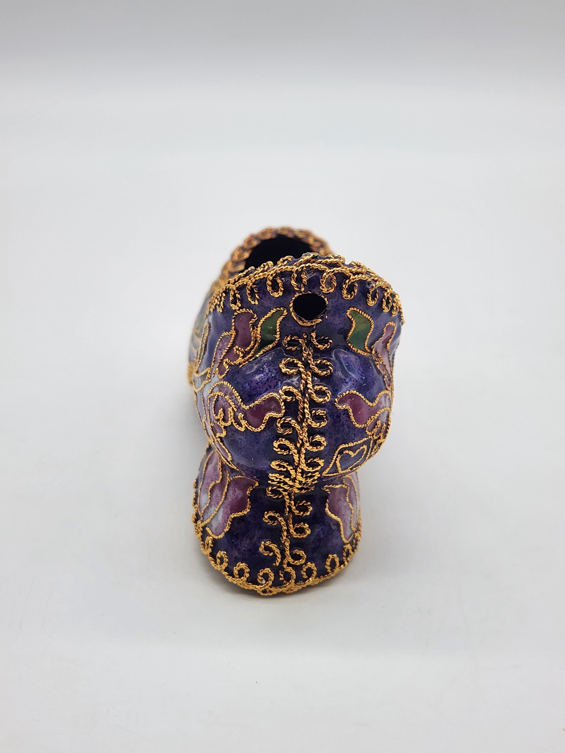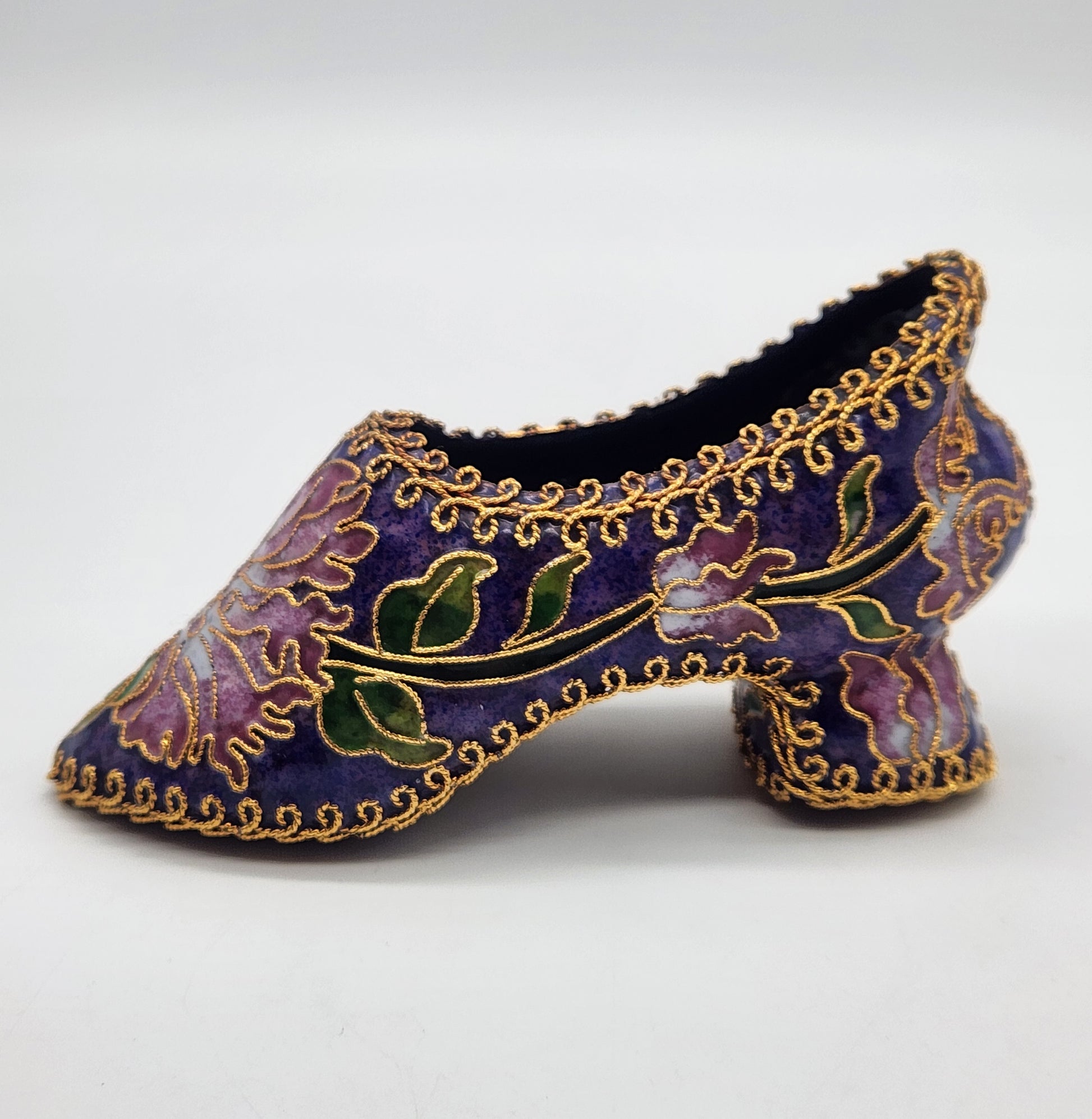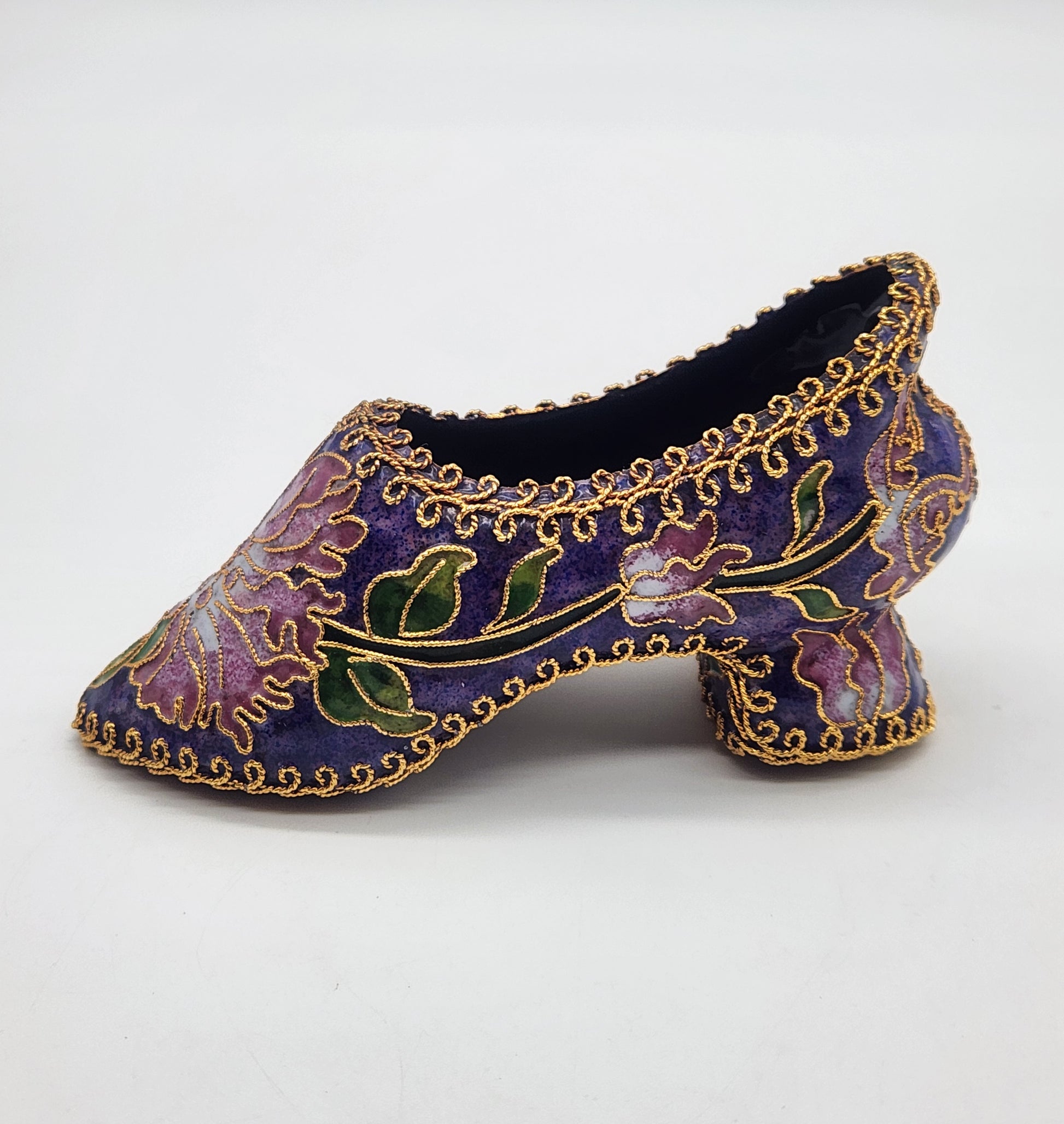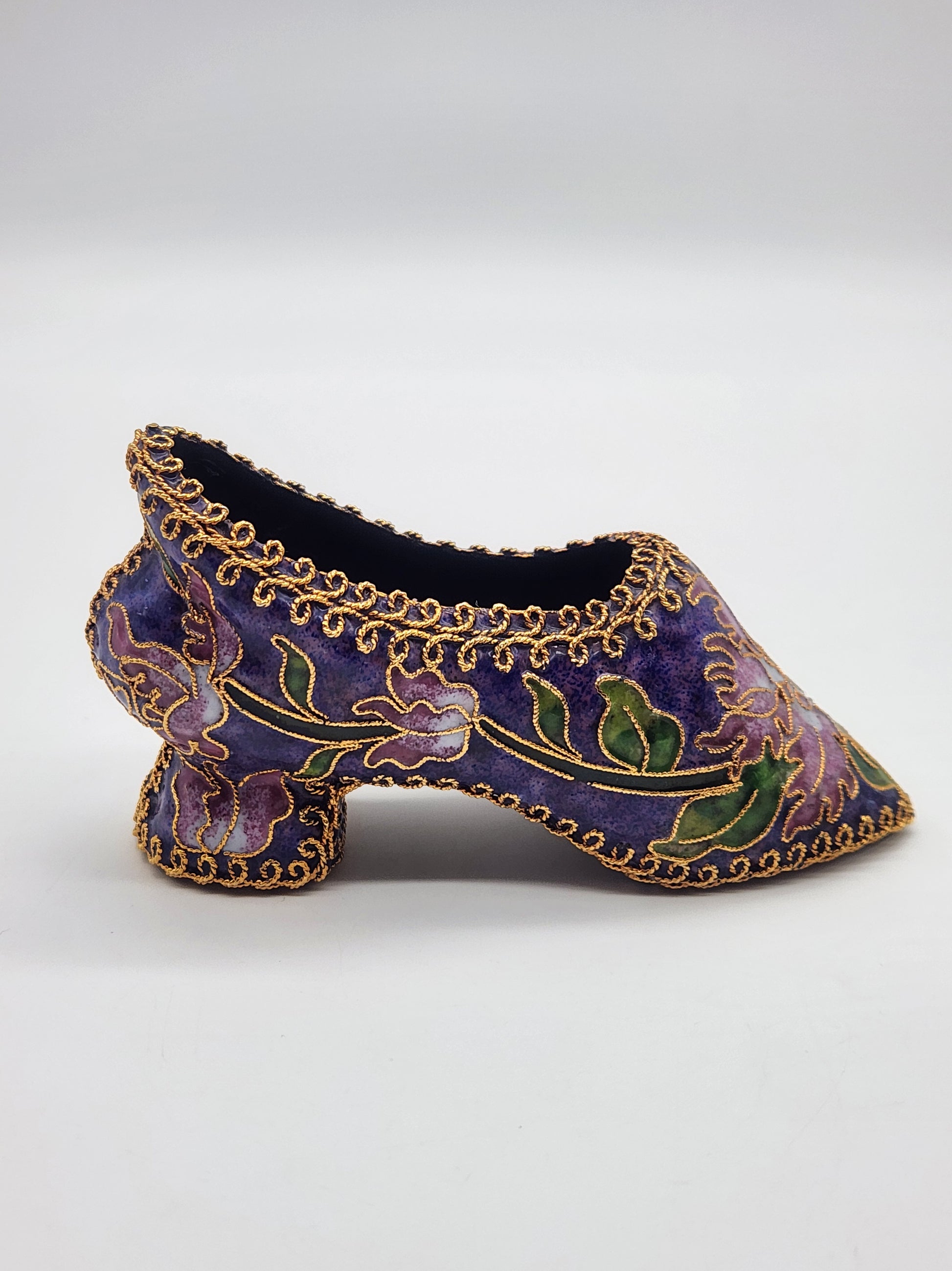 Vintage Cloisonné Enamel Heeled Shoe Ornament Purple with Pink & Green Floral Design Gold trim