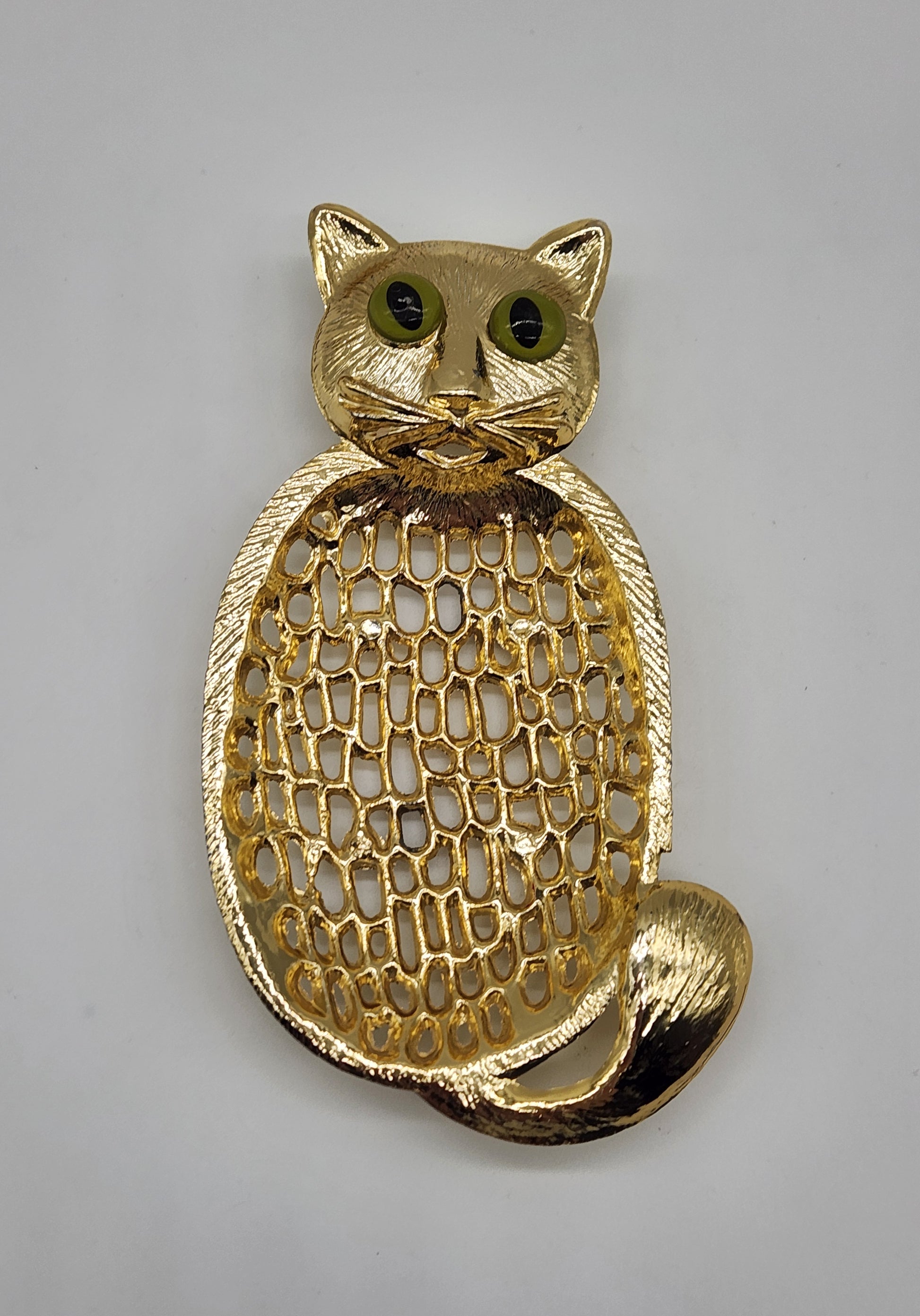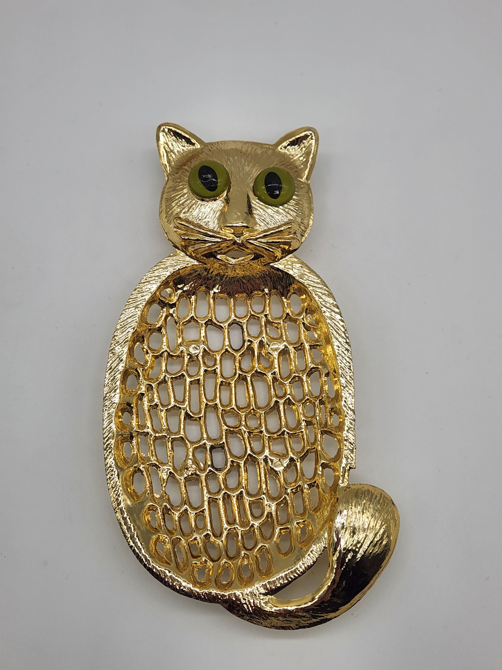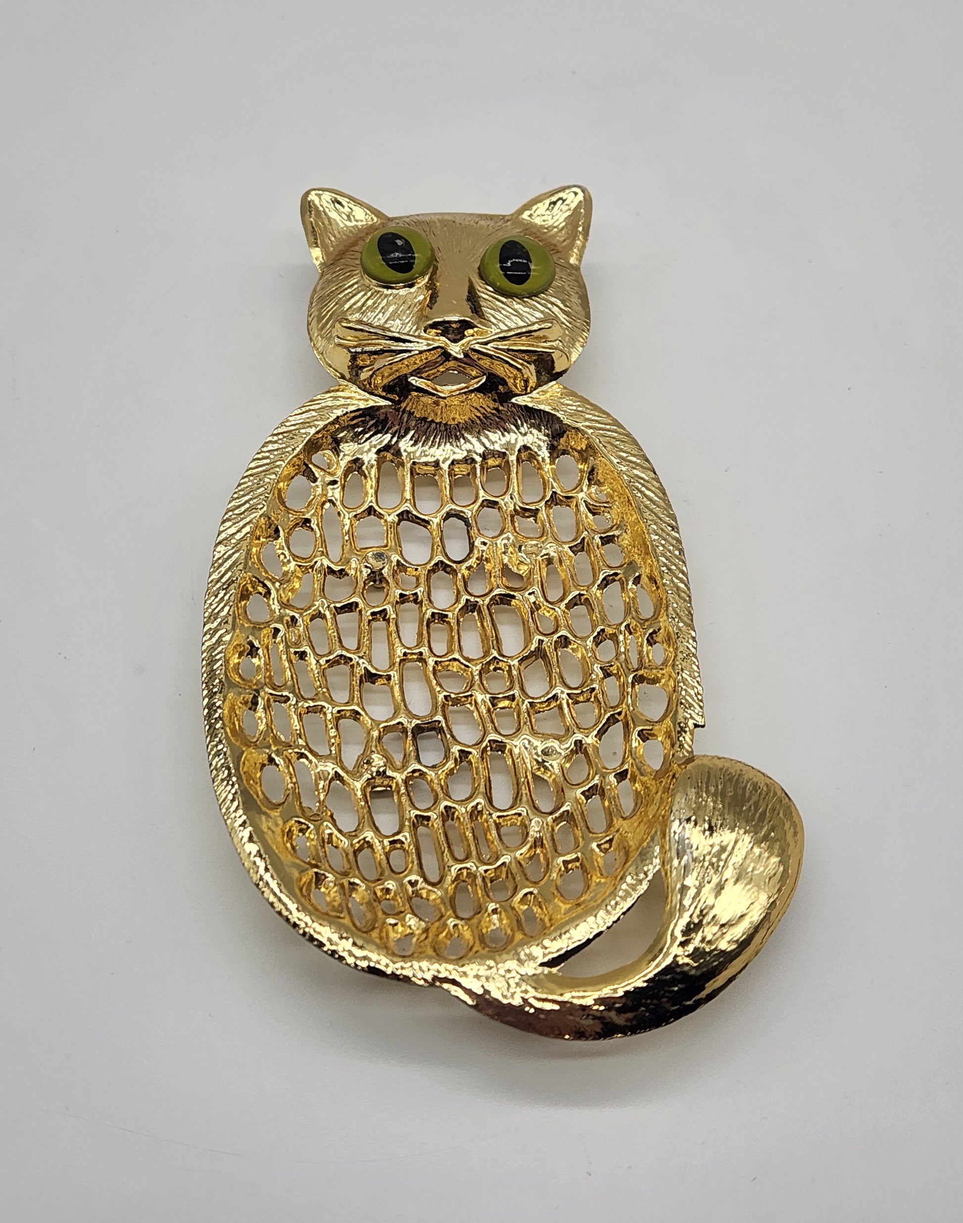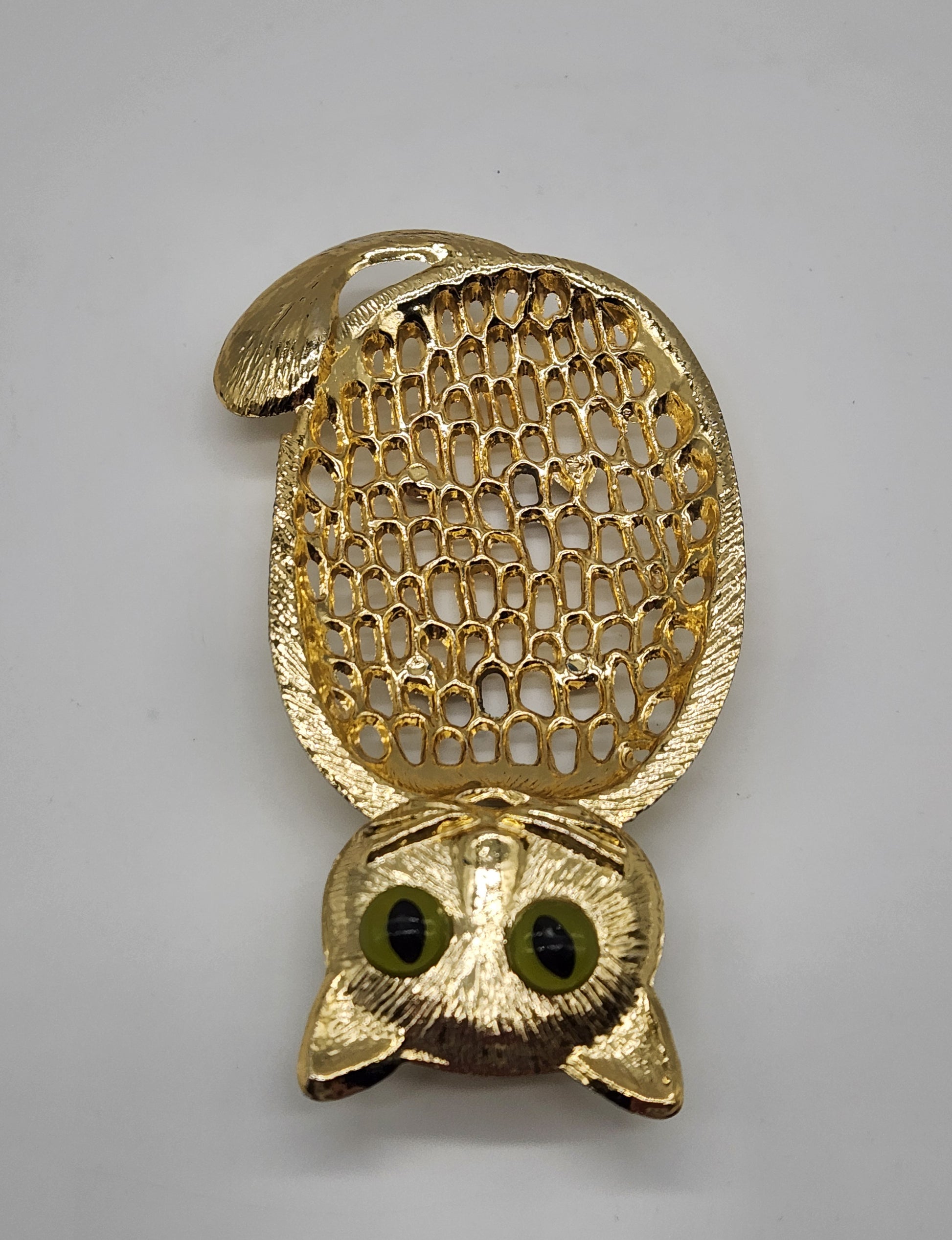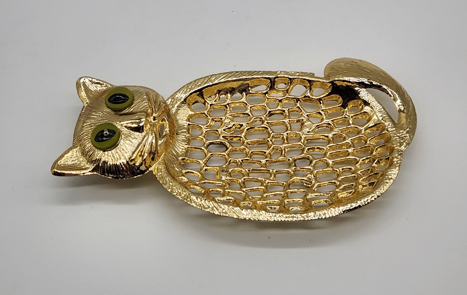 Vintage Gold Cat Soap or Trinket Dish/ Retro Goldtone Kitty with Resin Cat Eyes