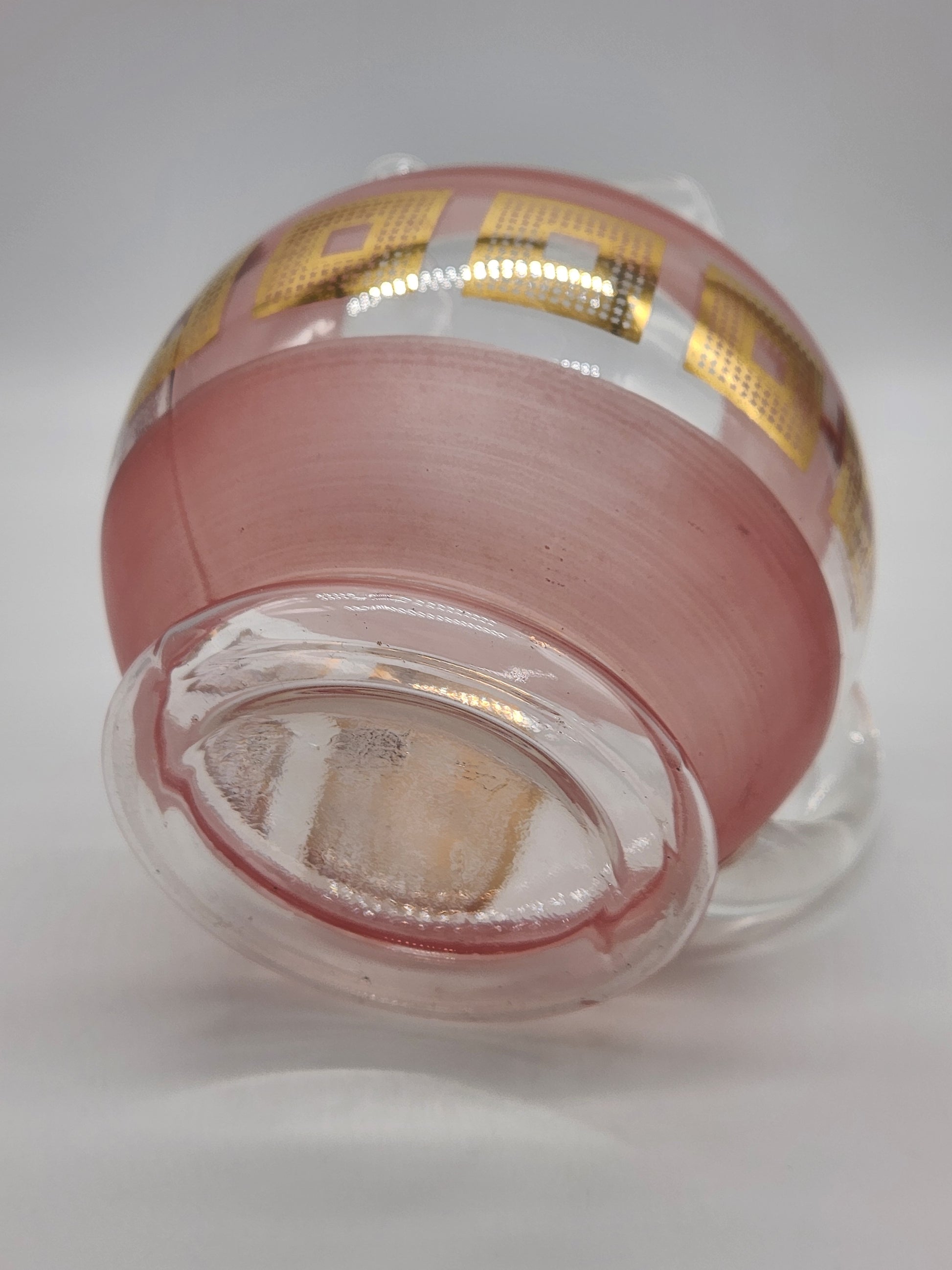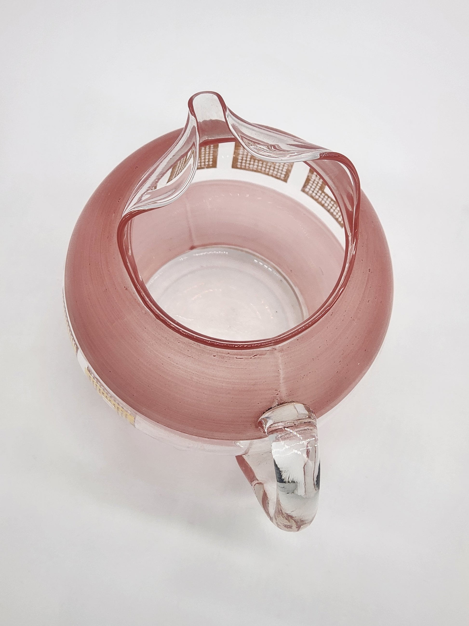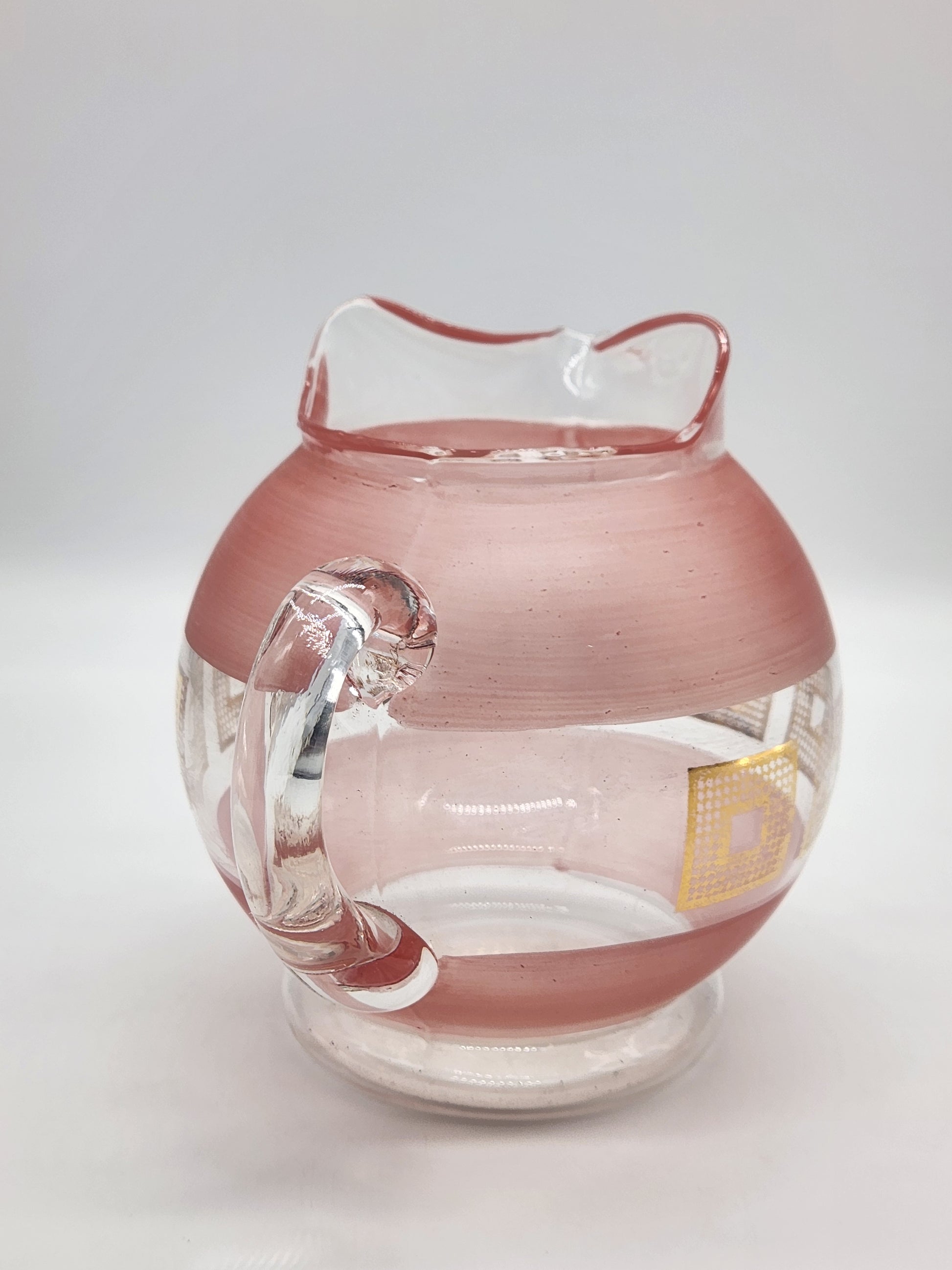Vintage MCM Glass Pitcher Clear And Frosted Pink Glass Gold Squares with Ice Lip. Some wear to the gold detailing. Approximately 5.5" tall x 5.5" width.