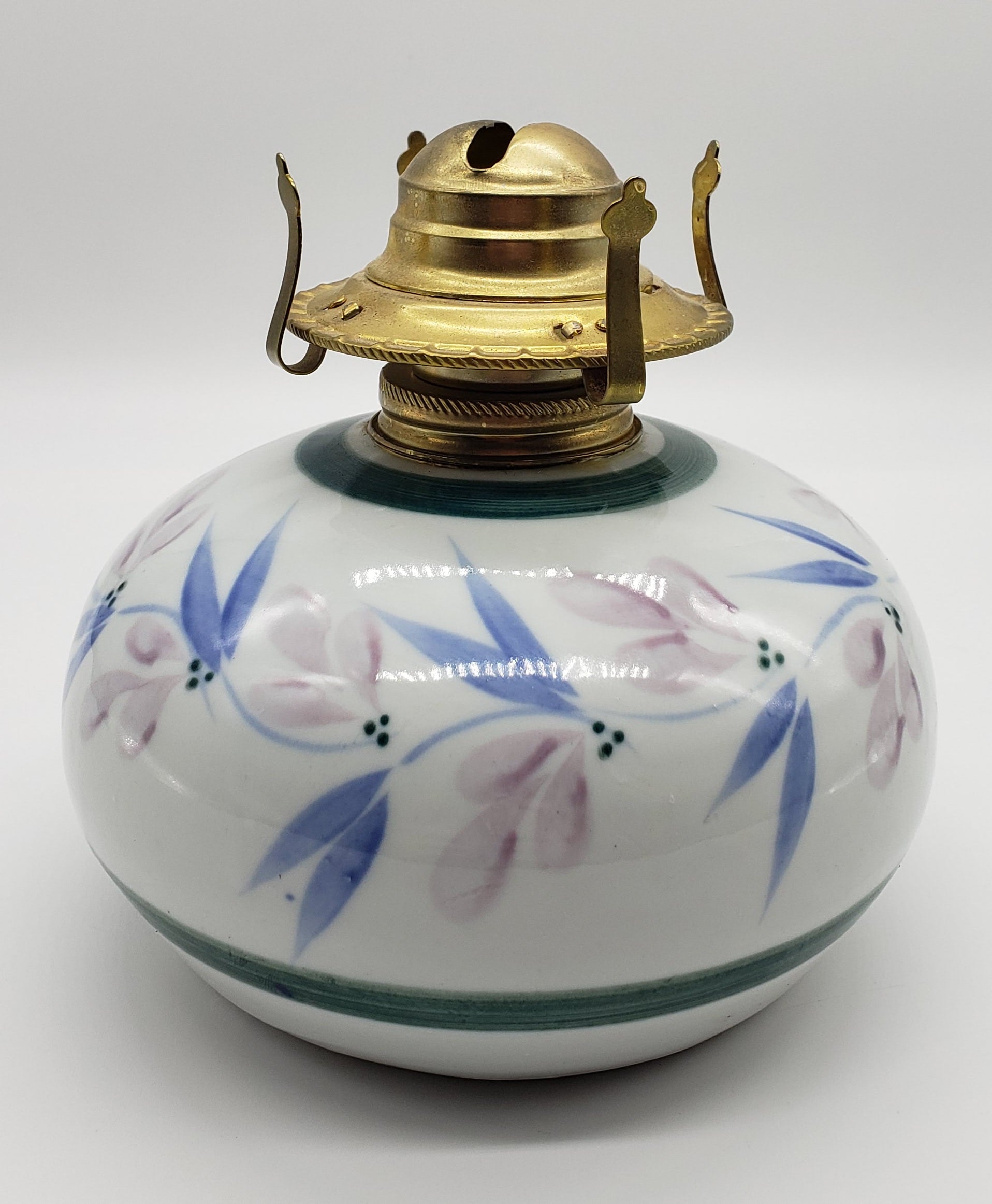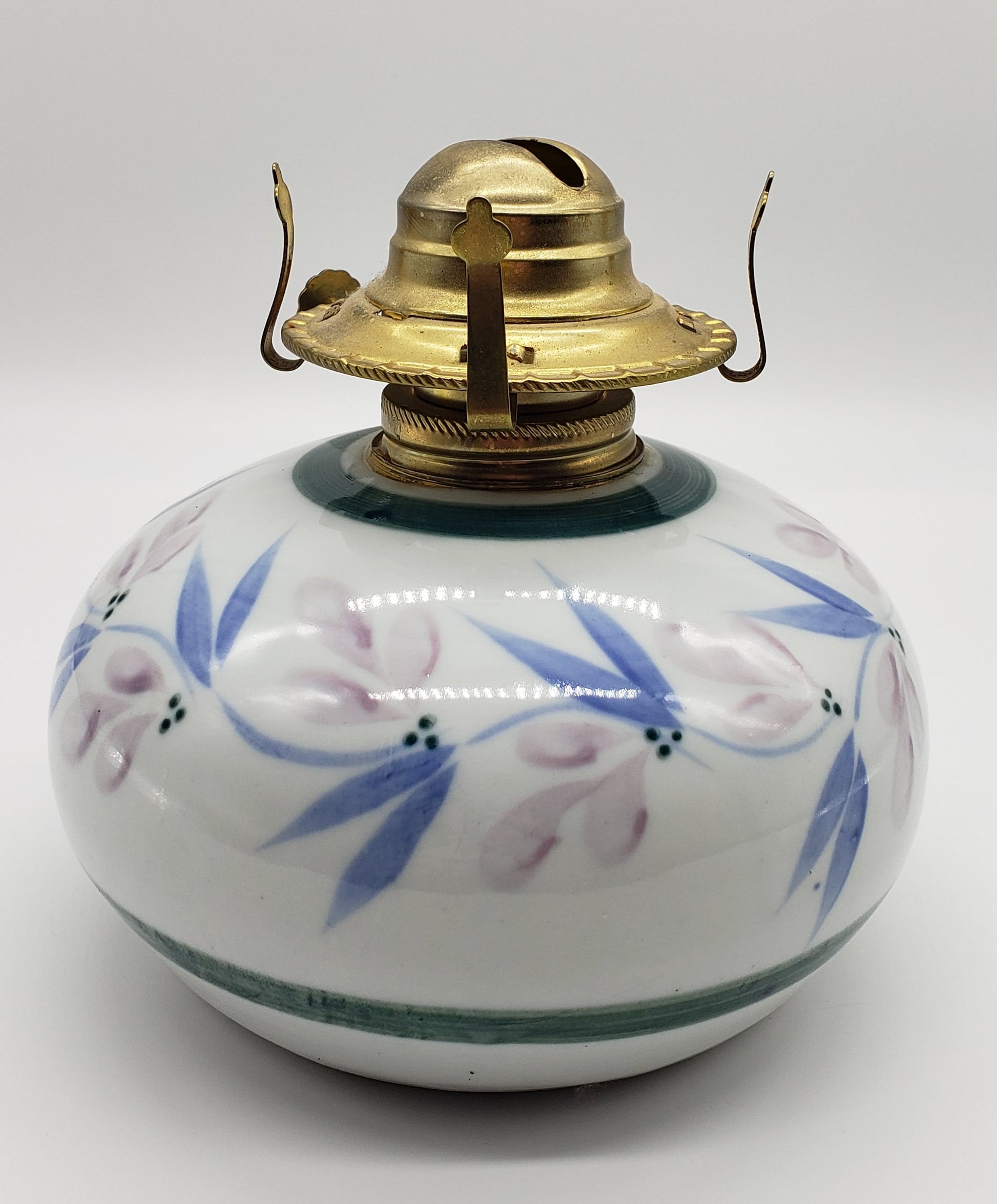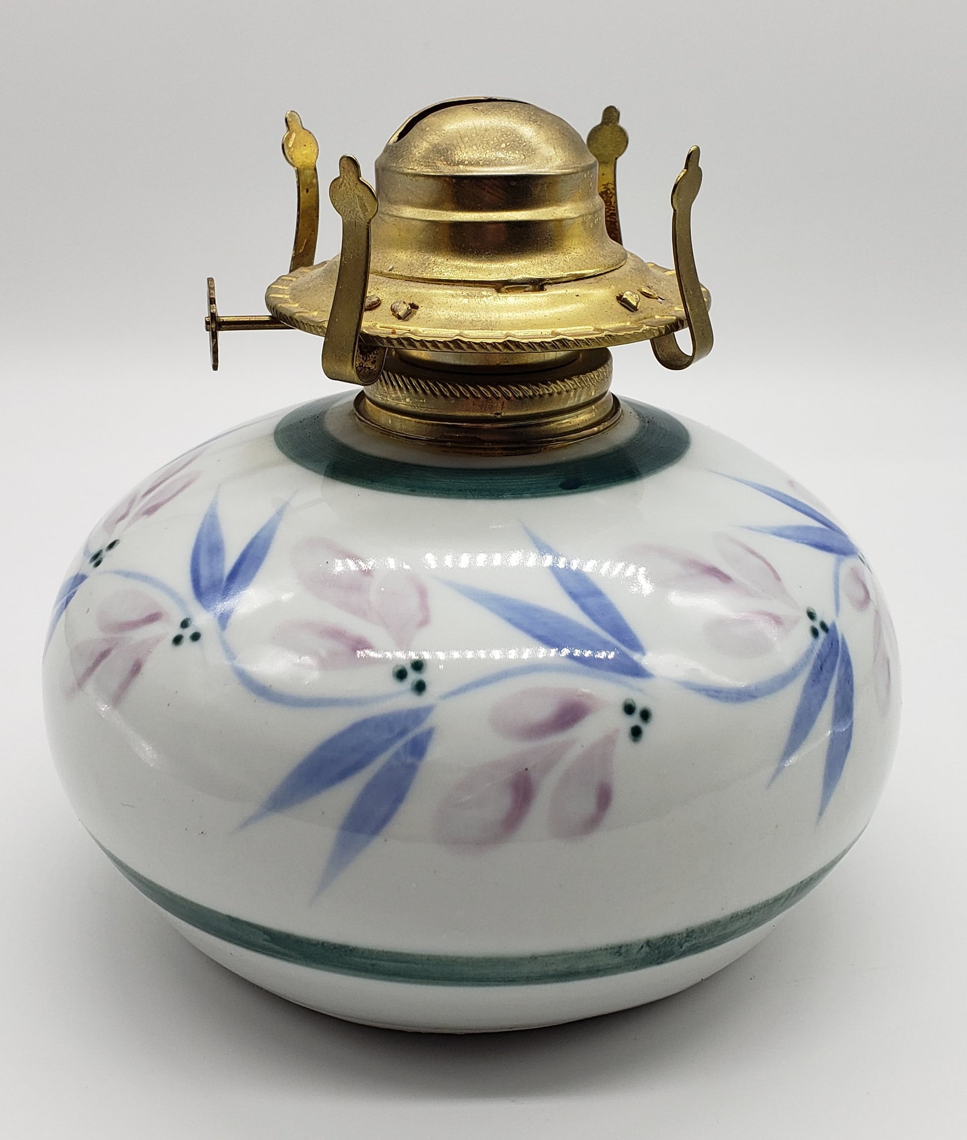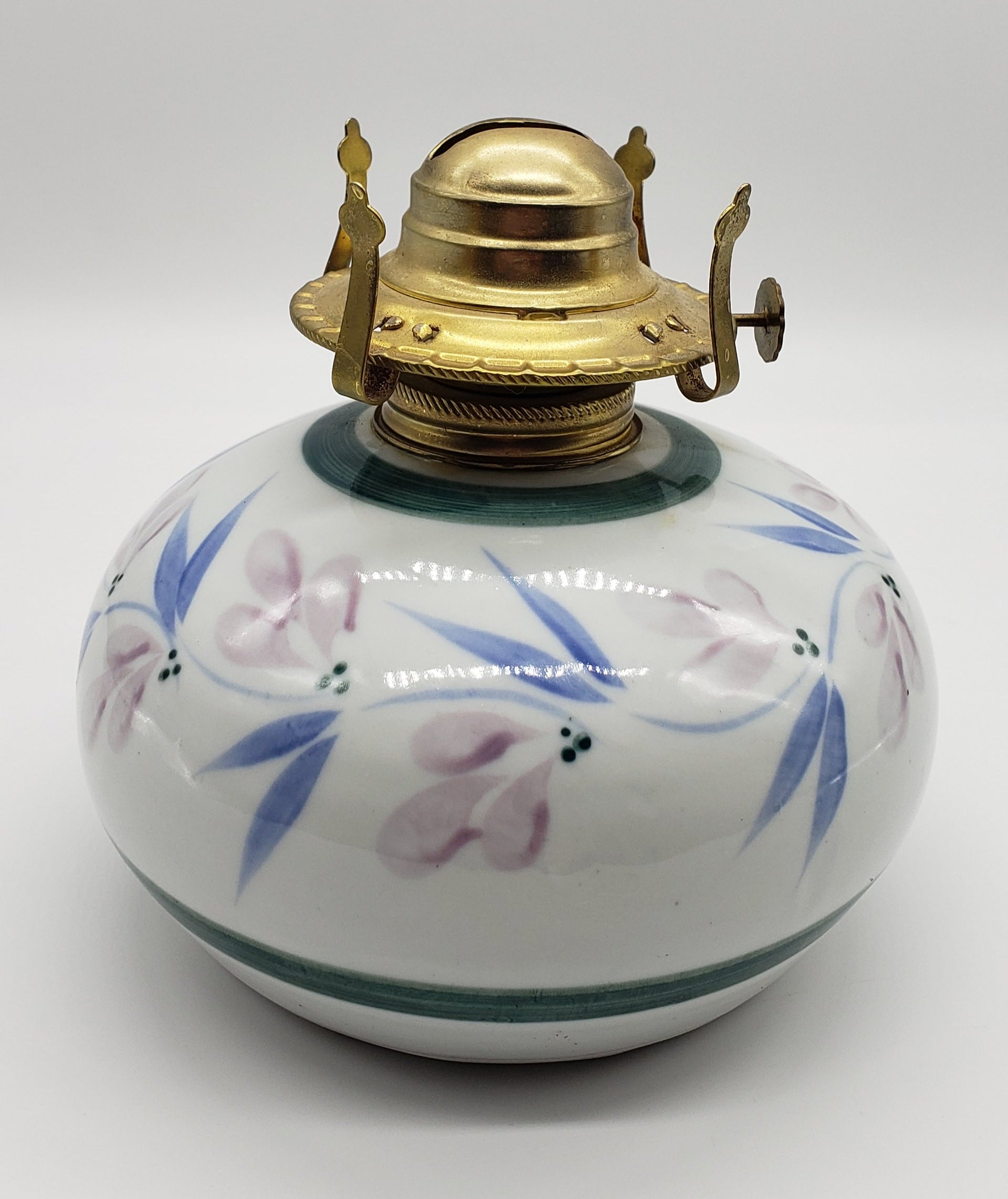Handmade Pottery Oil Lamp (No glass) featuring blue and purple floral design. Signed on bottom