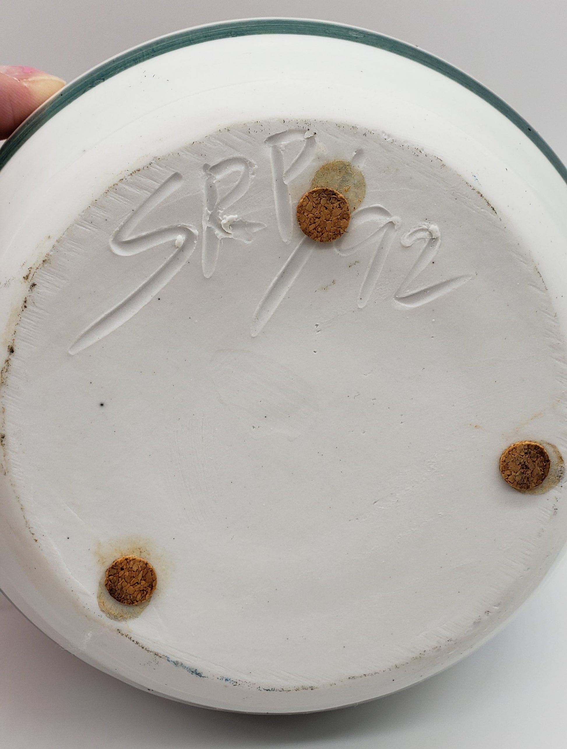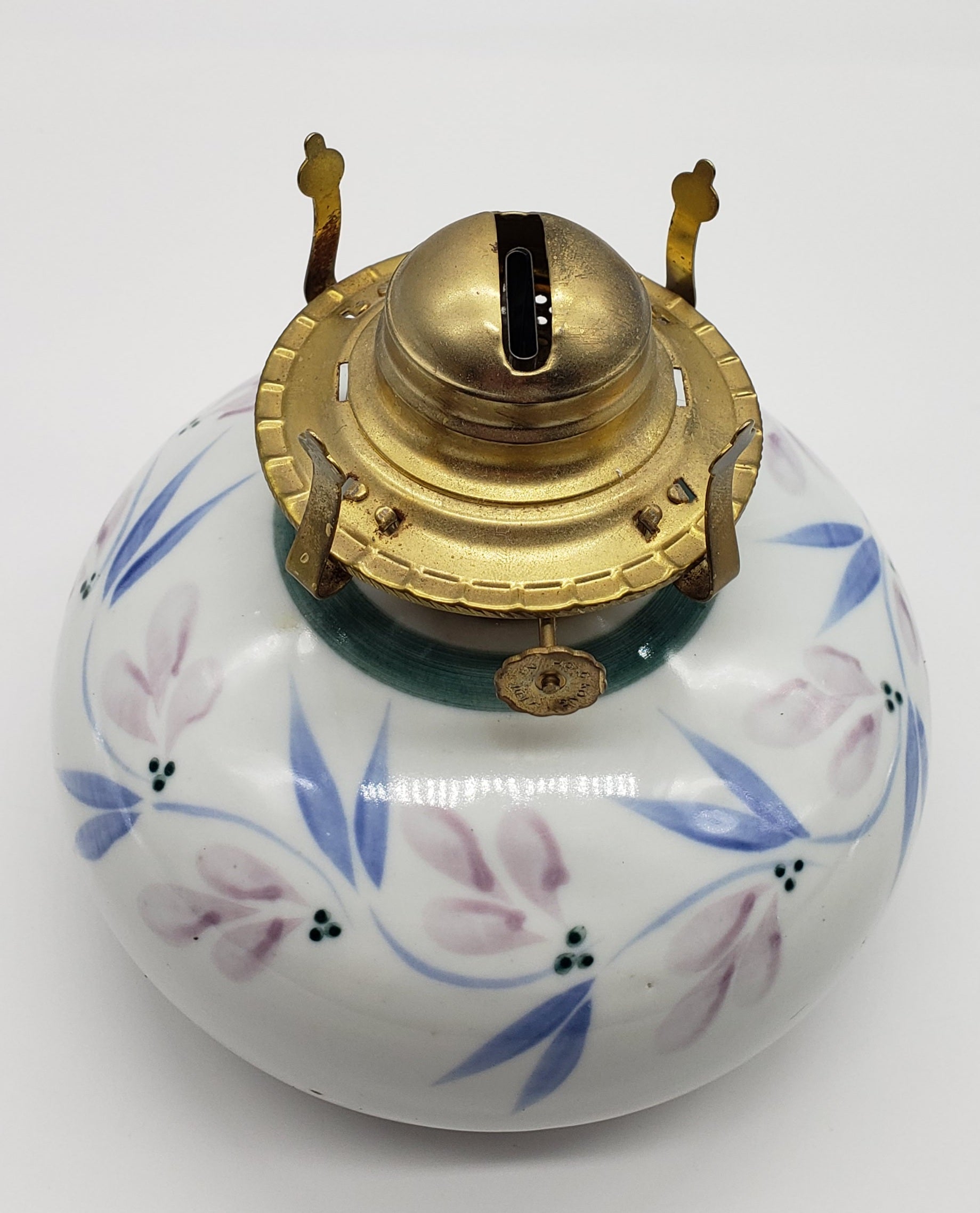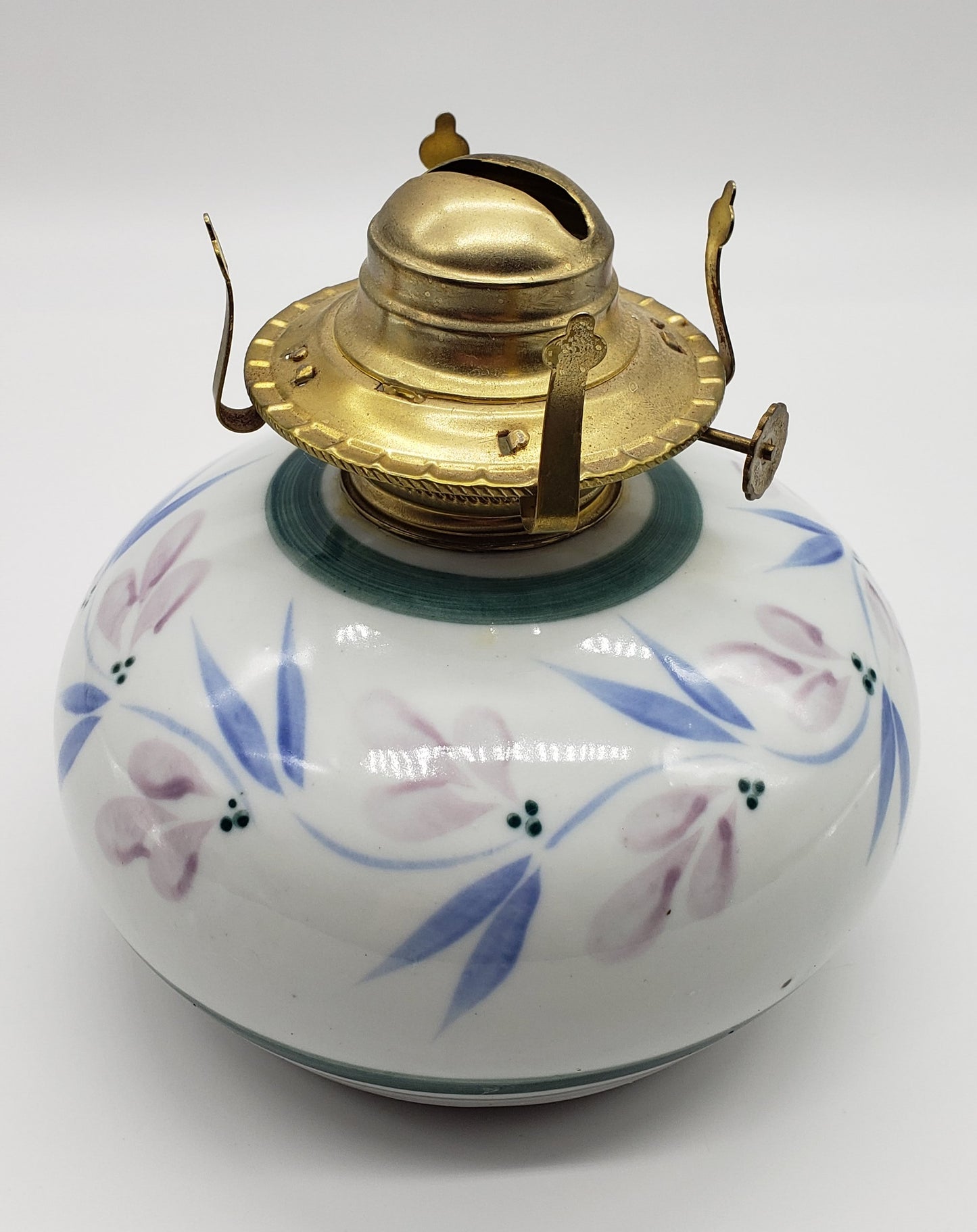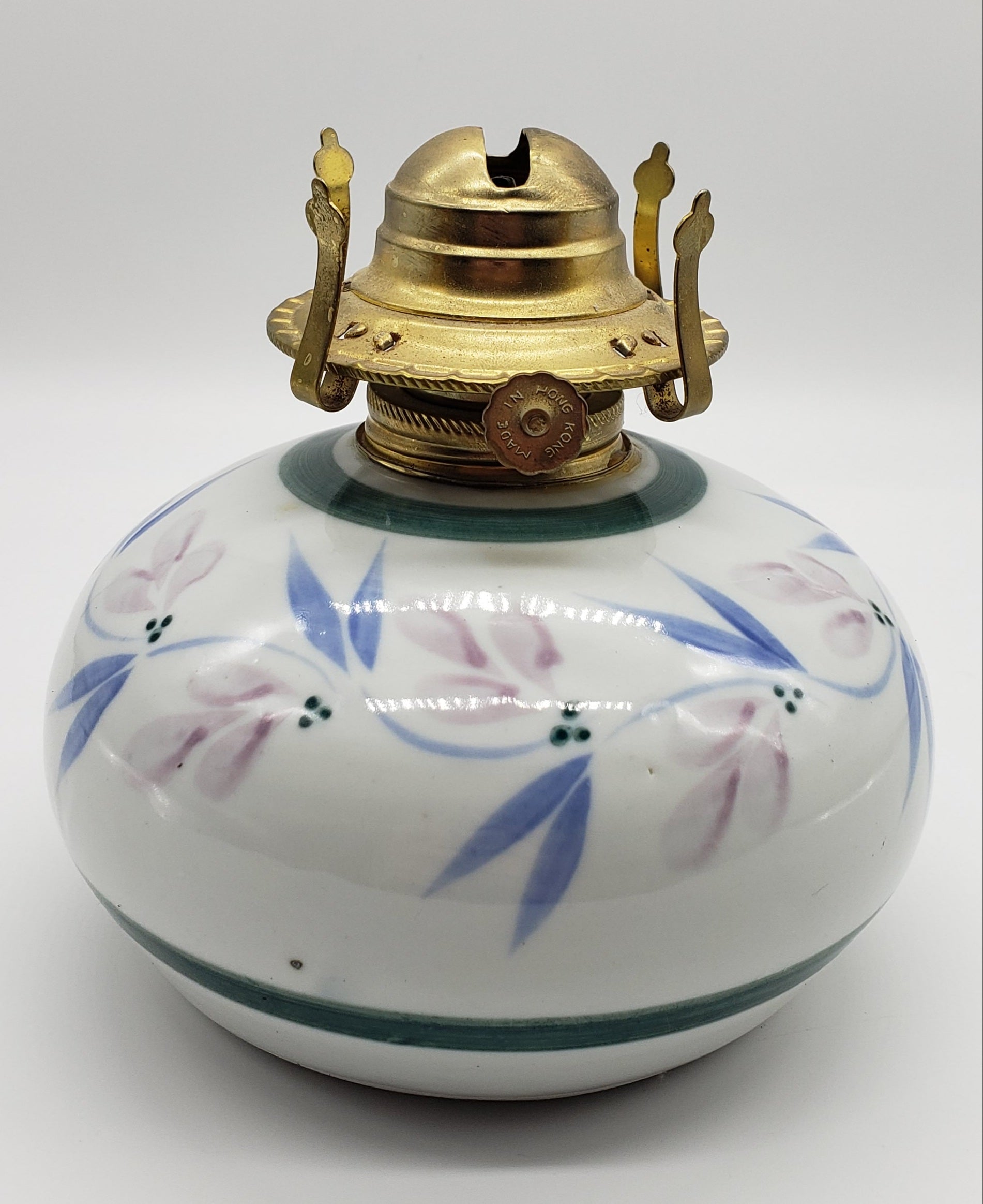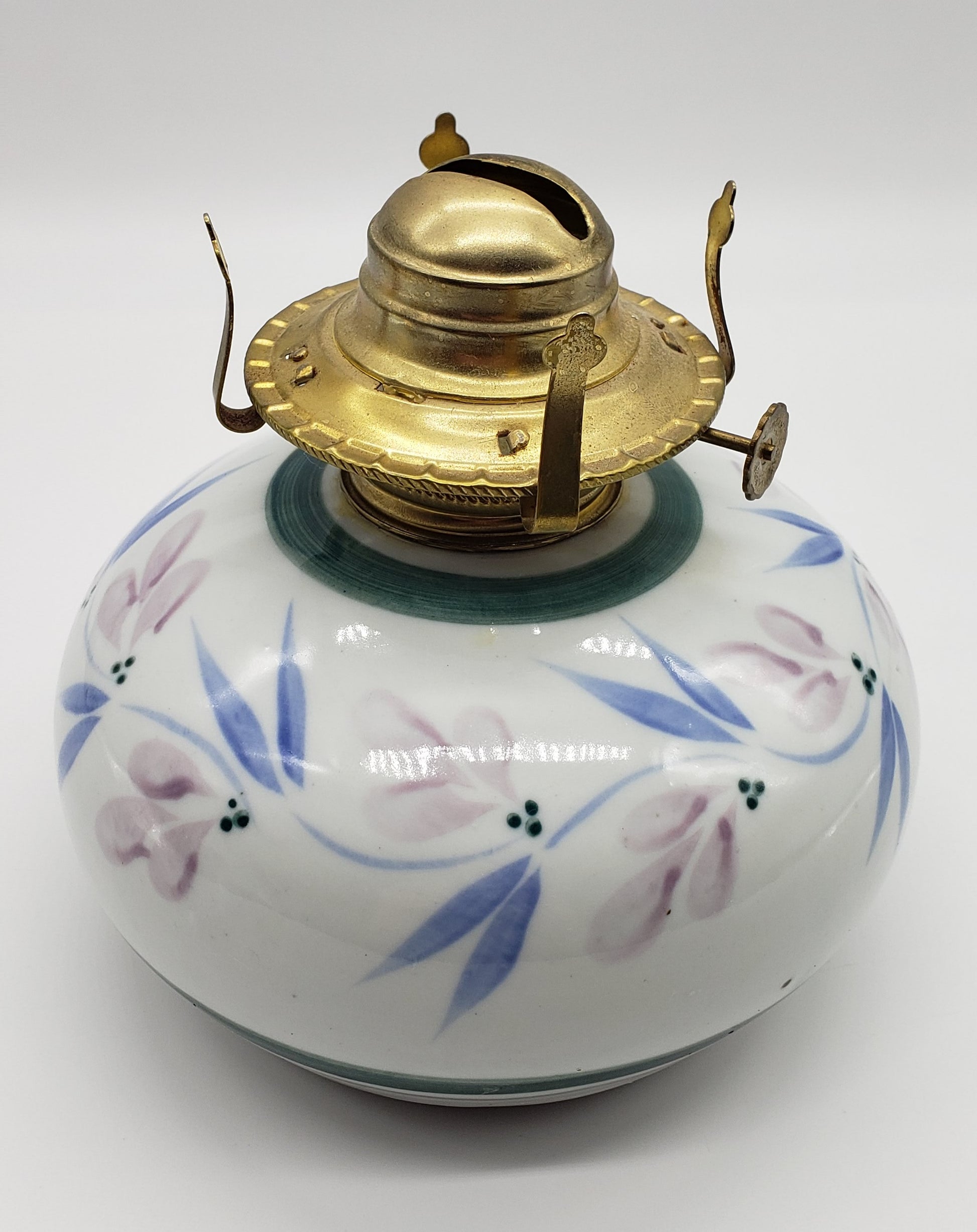 Handmade Pottery Oil Lamp (No glass) featuring blue and purple floral design. Signed on bottom