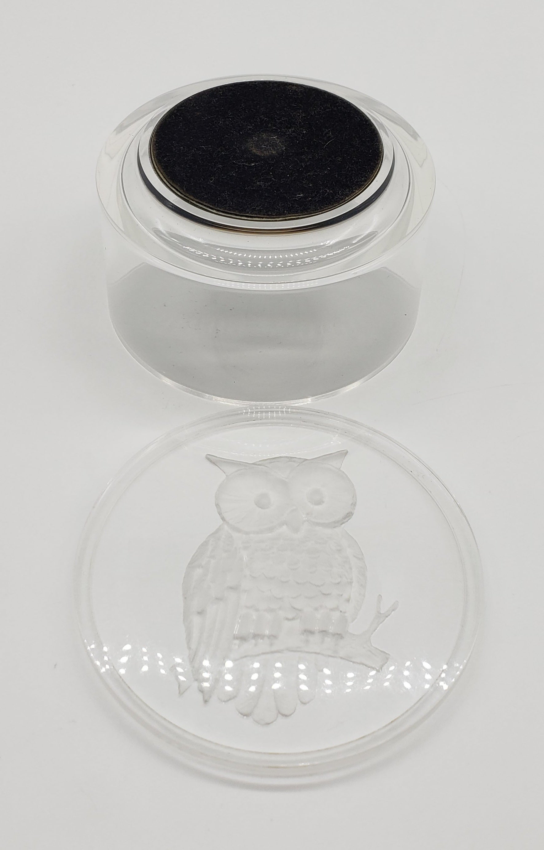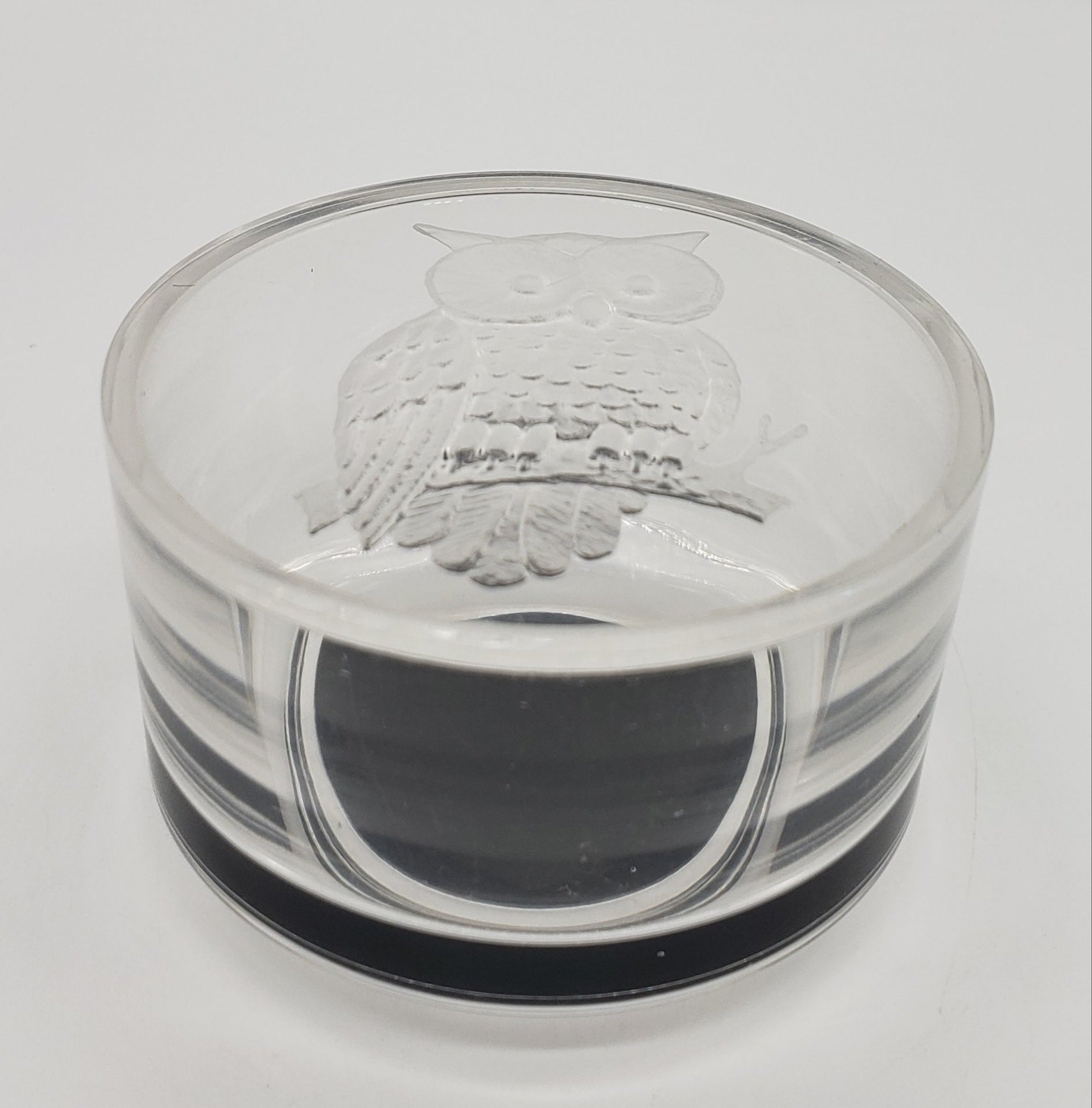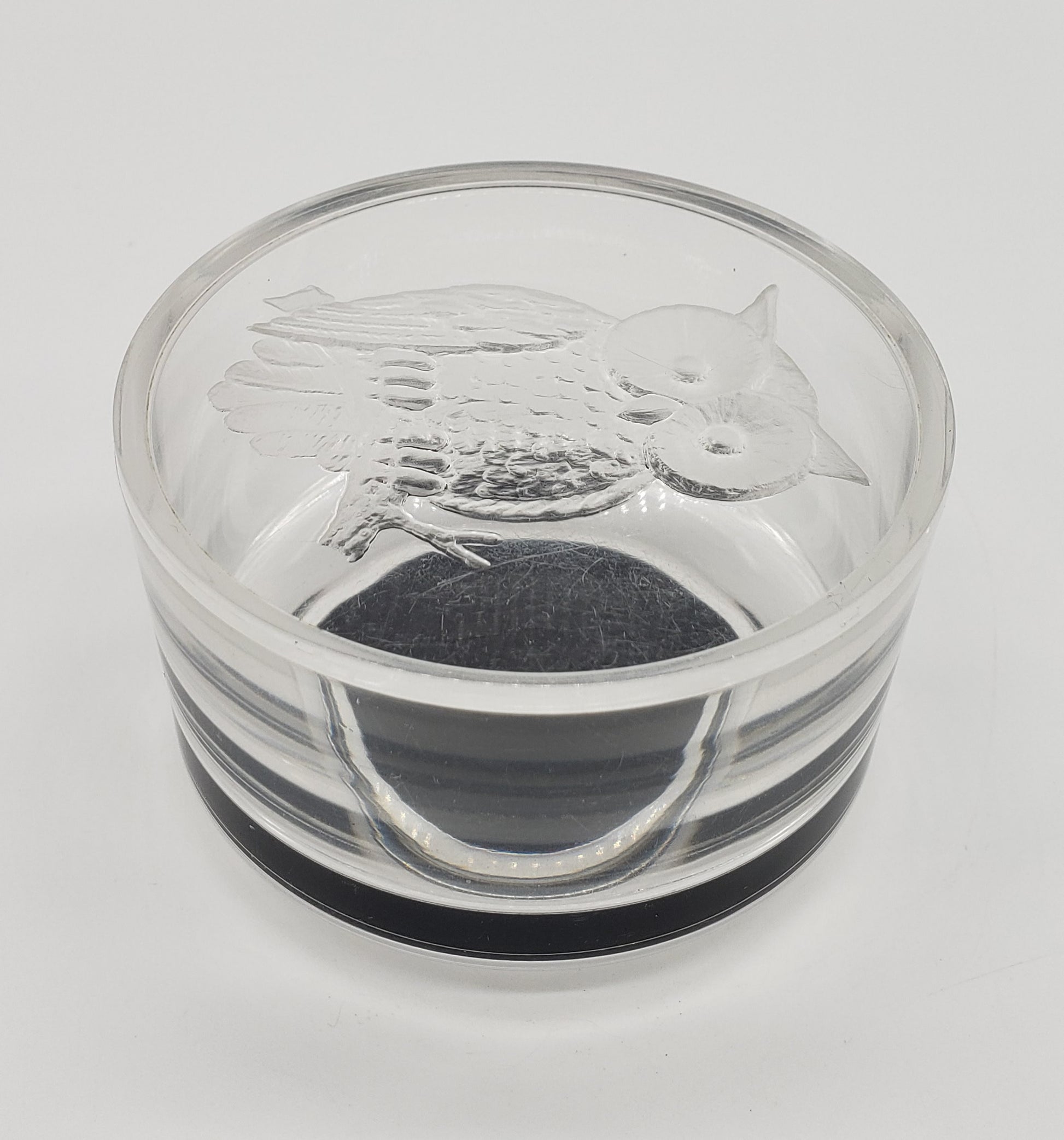 Cute small vintage owl trinket dish. In a beautiful clear plastic. Looks like glass! The owl is adorable and in a frosted 3D looking design. The inside has black felt on bottom to protect your rings, or jewelry. The bottom also has felt to protect your table or dresser from scratches.