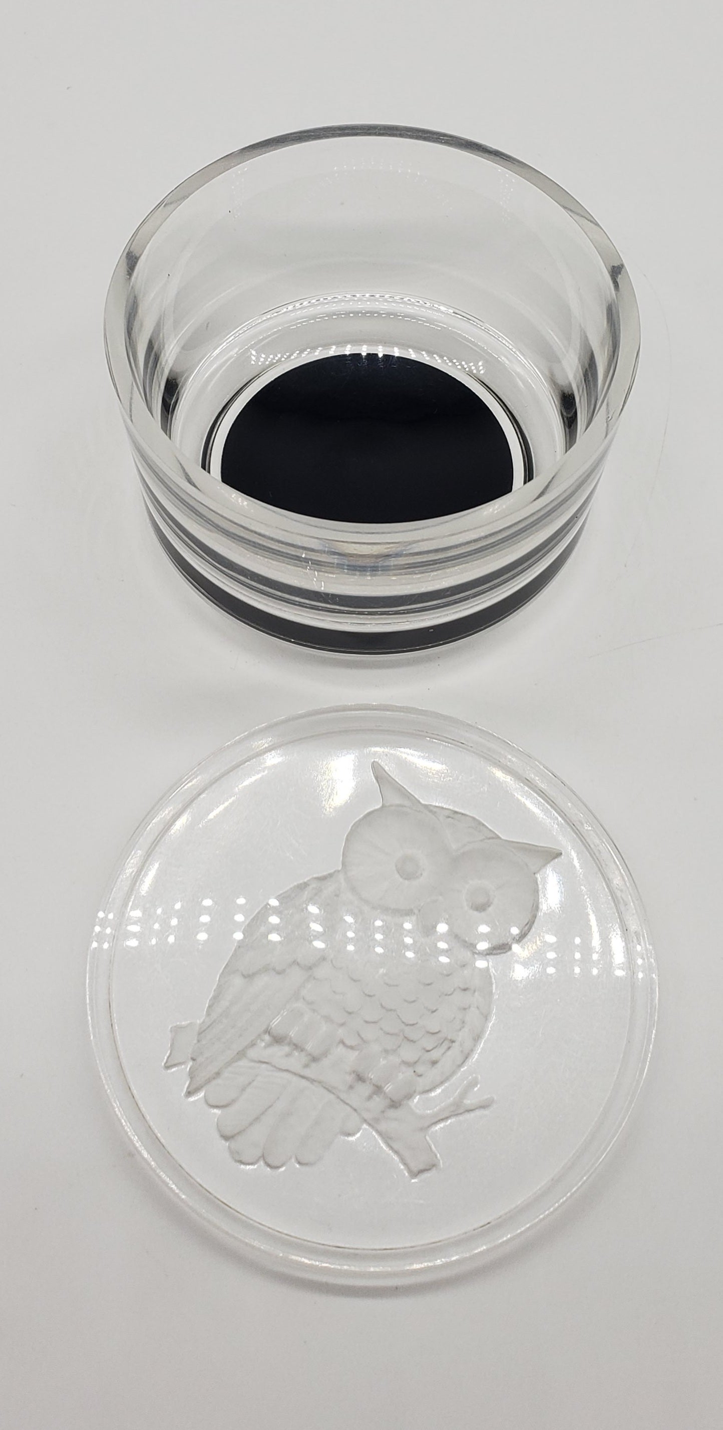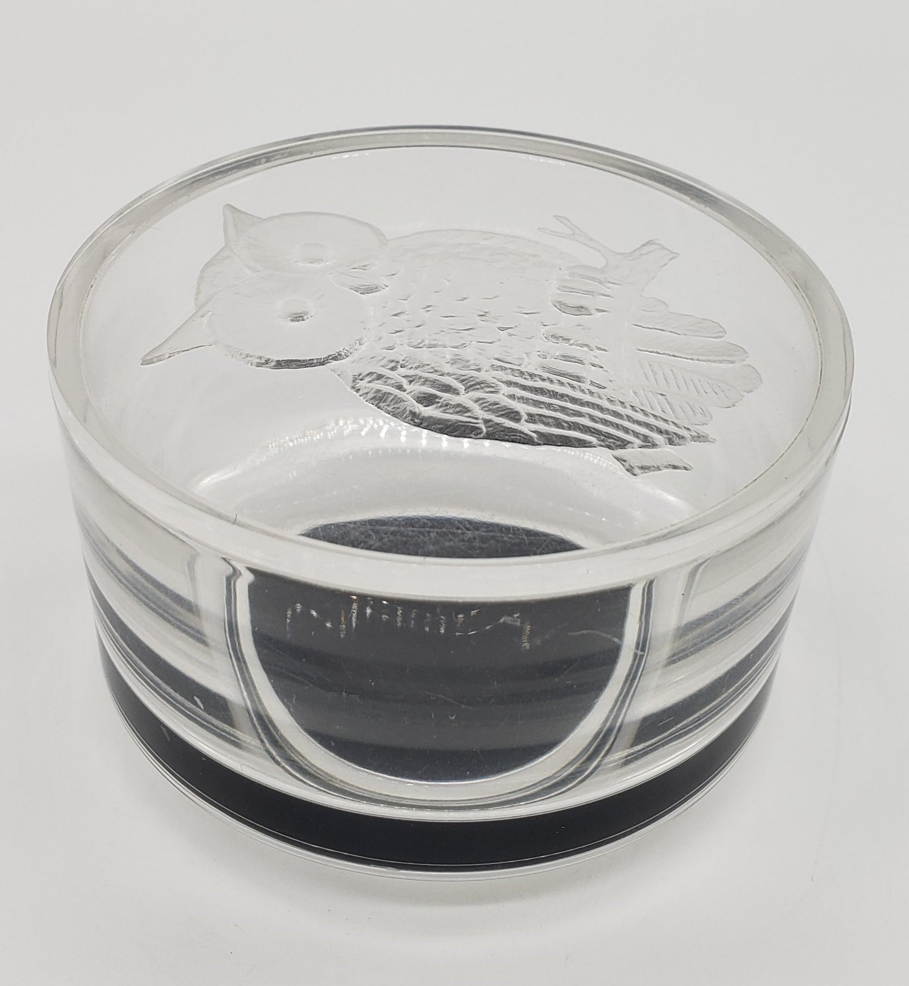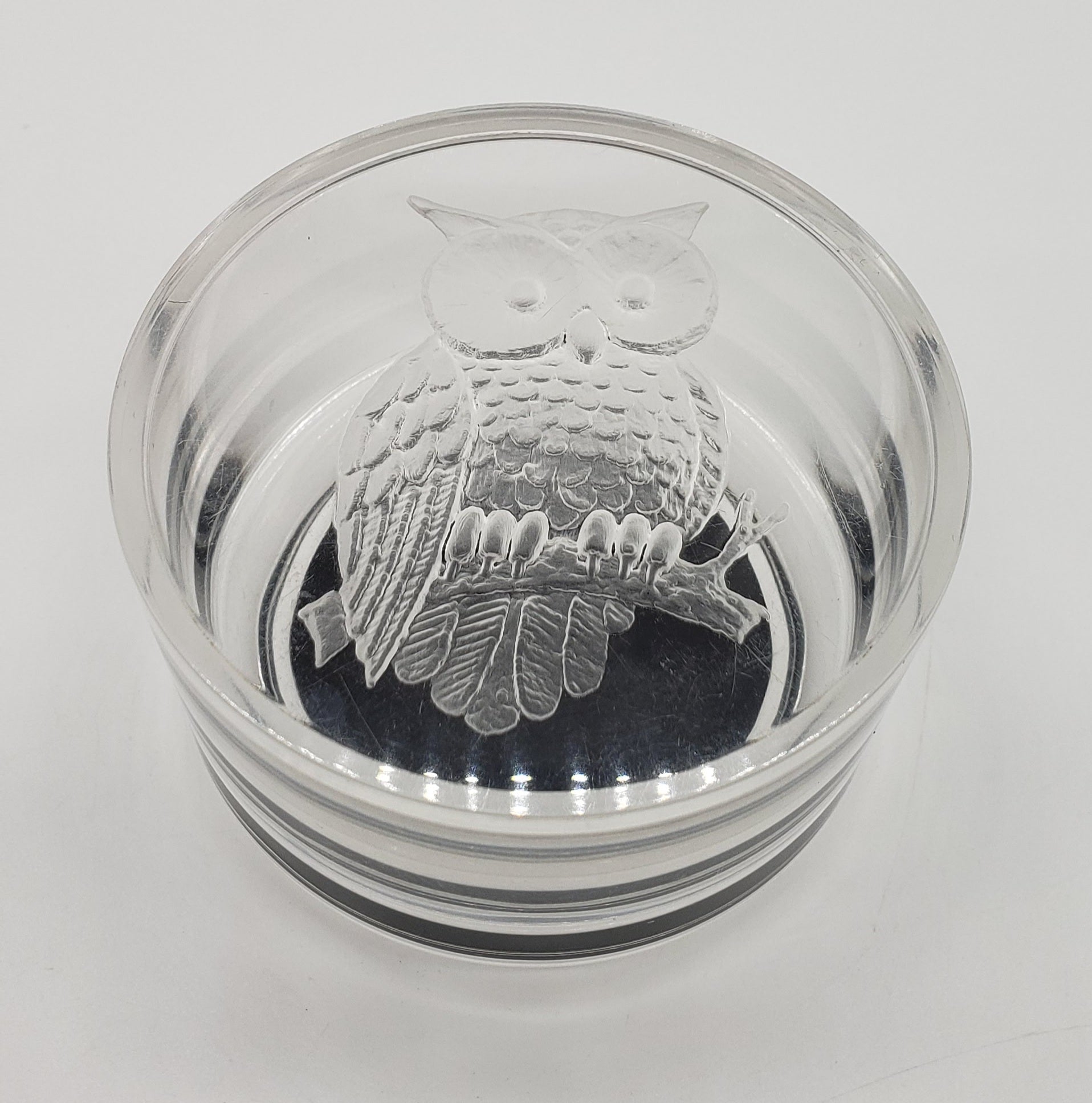 Cute small vintage owl trinket dish. In a beautiful clear plastic. Looks like glass! The owl is adorable and in a frosted 3D looking design. The inside has black felt on bottom to protect your rings, or jewelry. The bottom also has felt to protect your table or dresser from scratches.