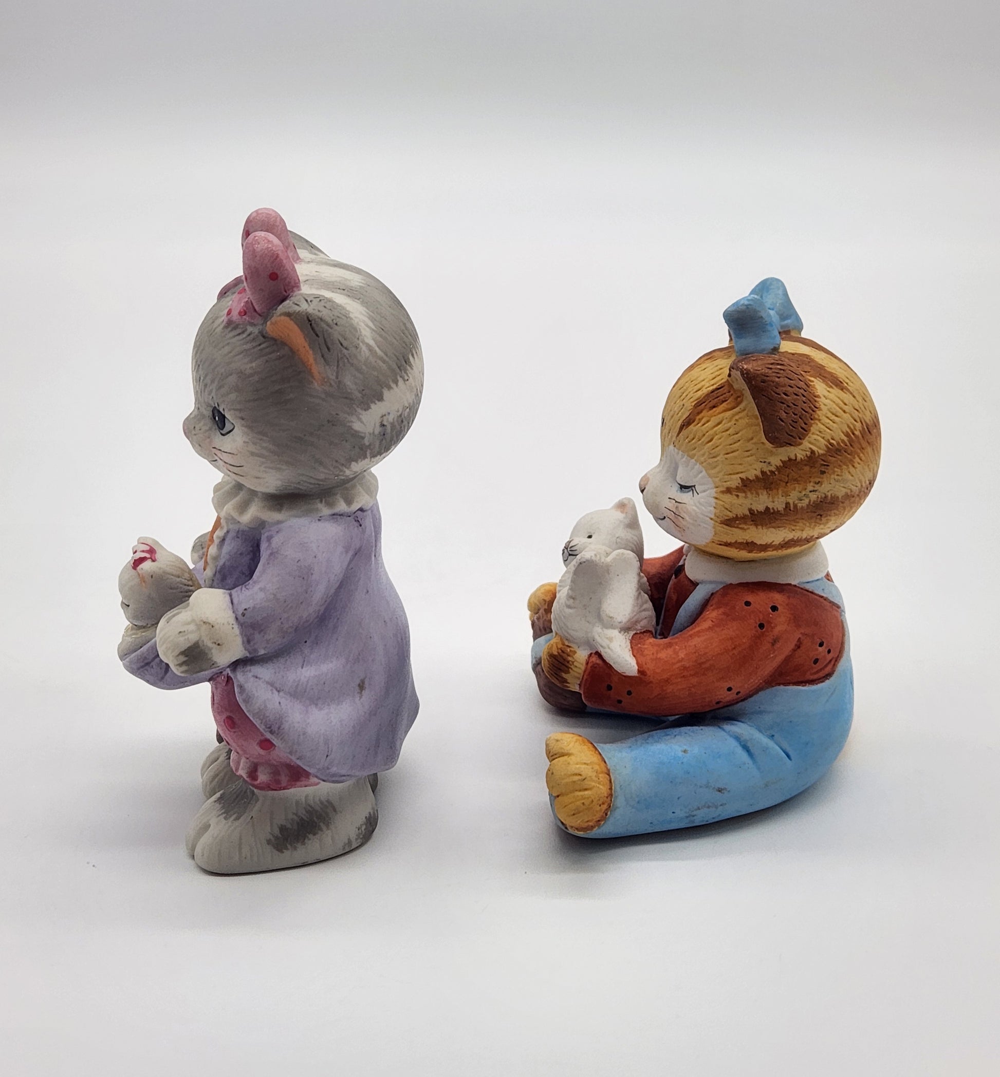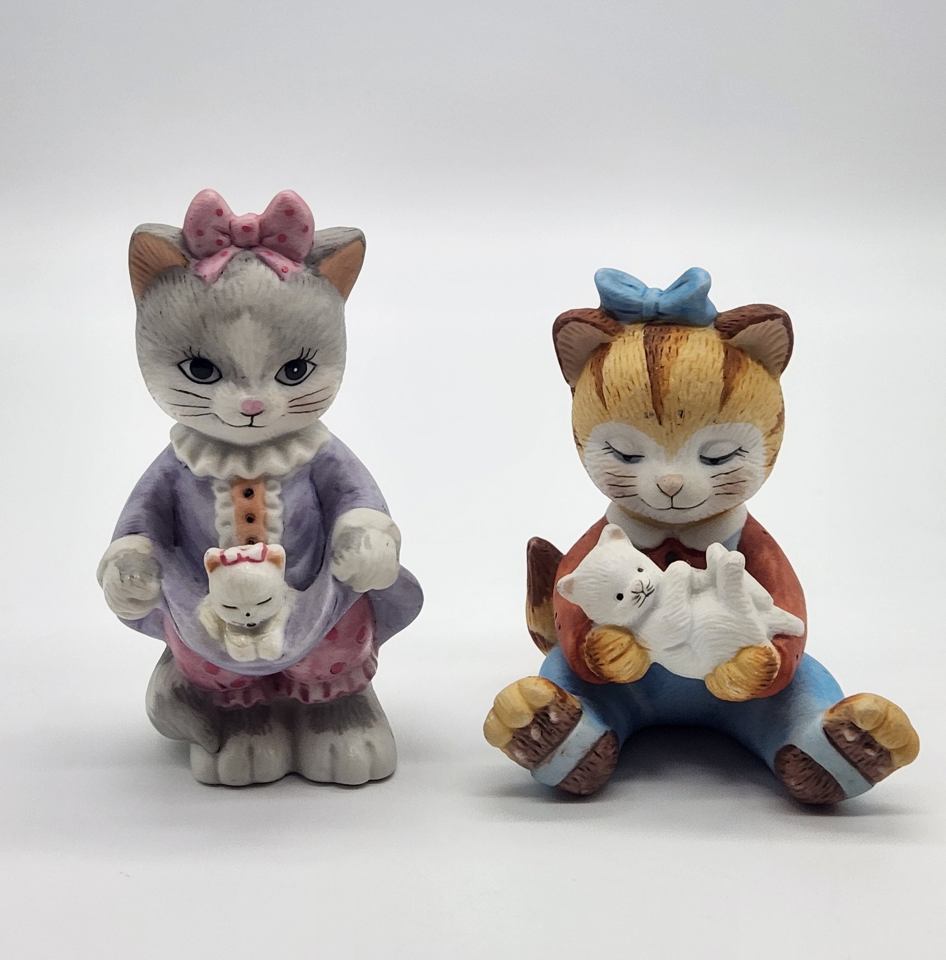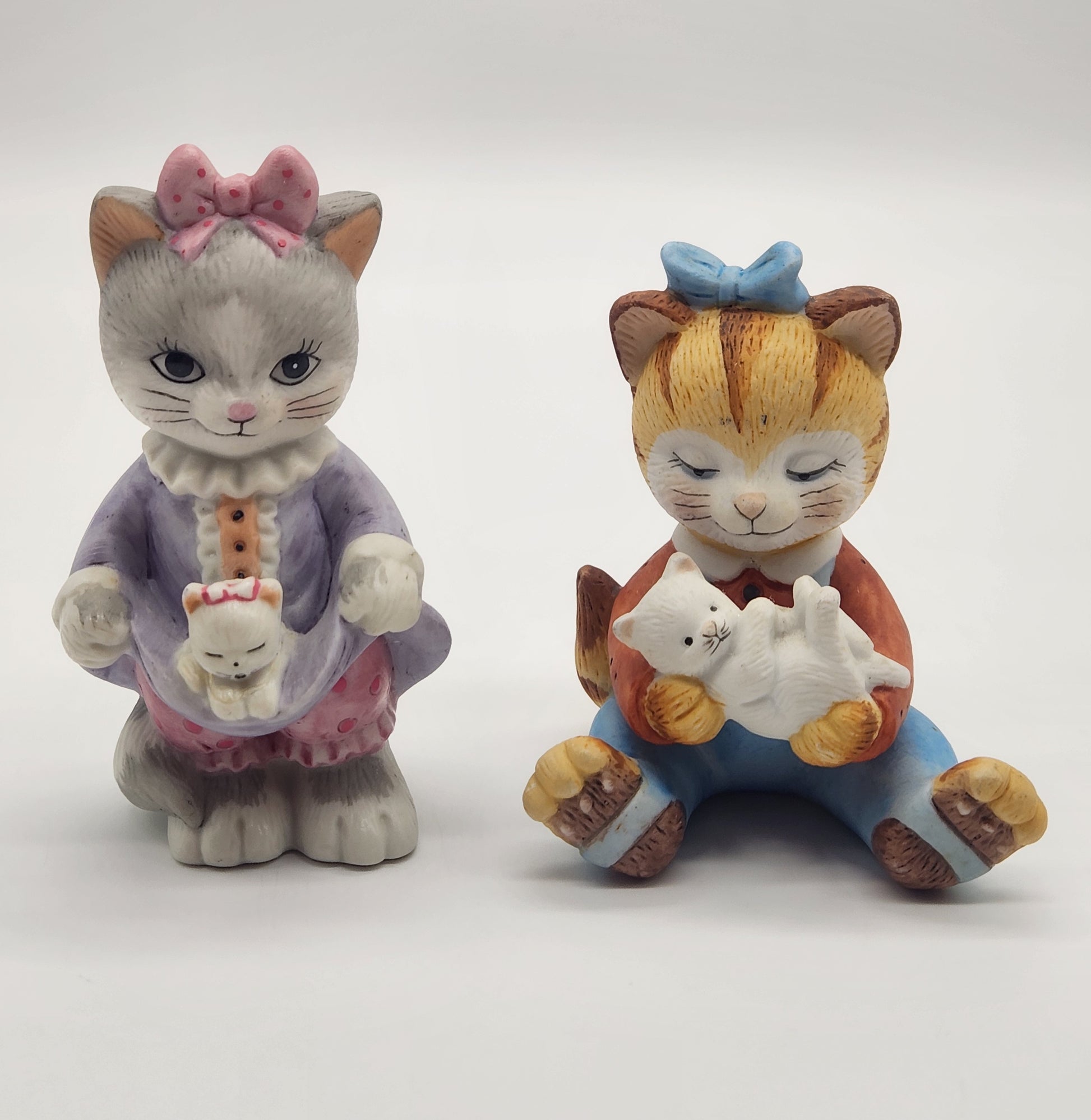 Vintage Pair of Bronson Collectibles BC Porcelain Cat Figurines. Sitting tabby cat is wearing blue overalls with a blue bow holding a little white kitten measures approximately 2" wide x 3" tall. Standing grey cat is wearing a purple dress with a pink bow holding a little white kitten measures approximately 1.5" wide x 3.5" tall.