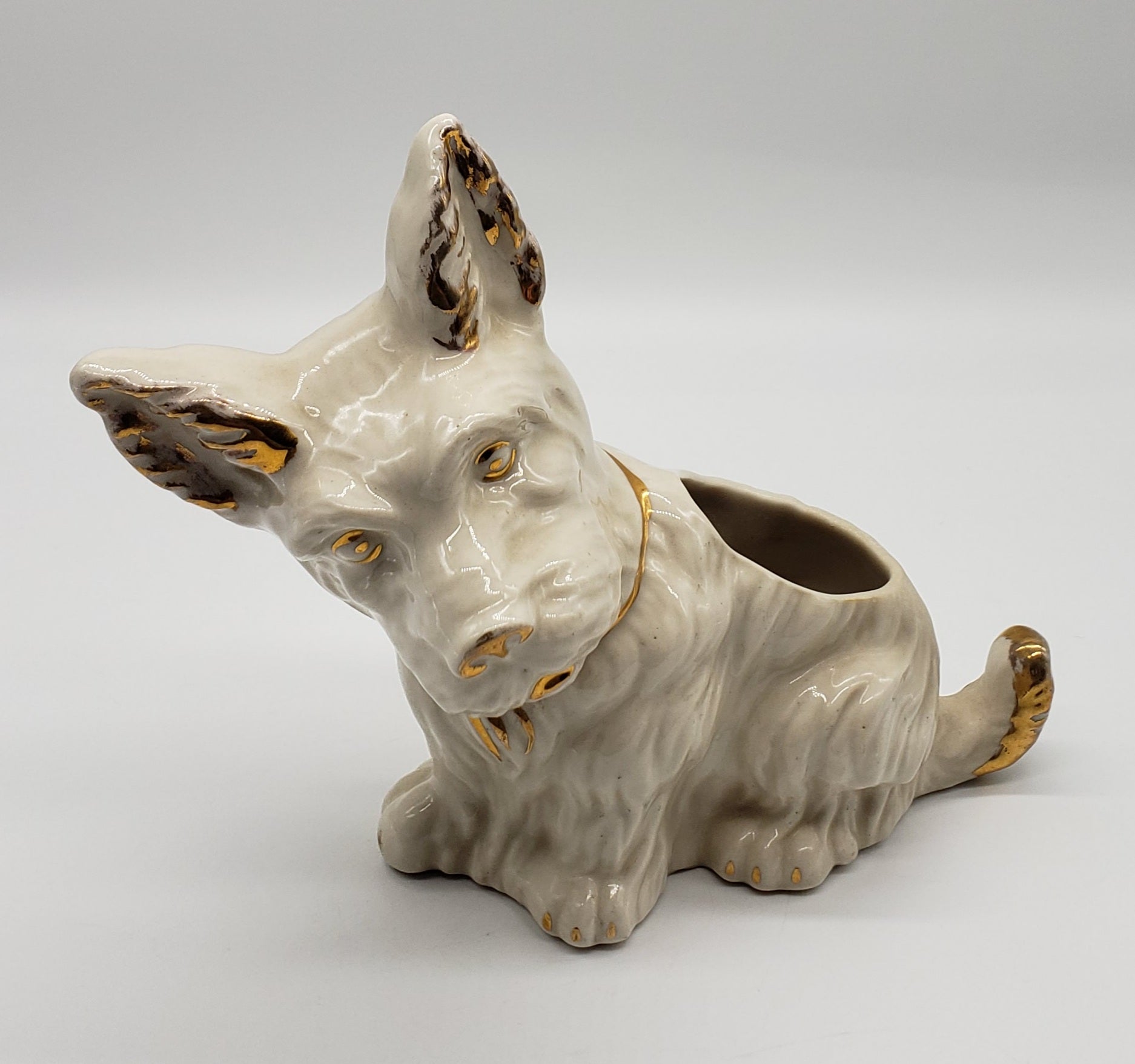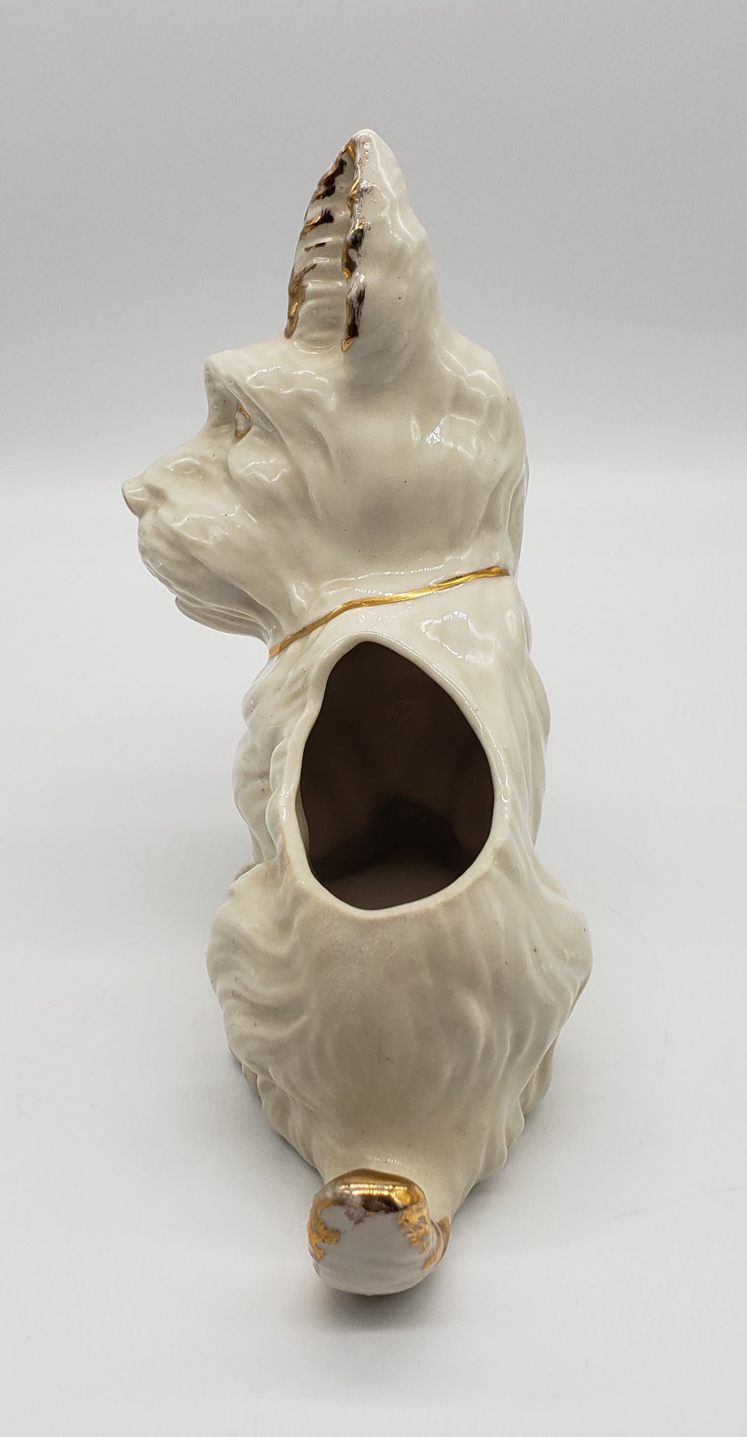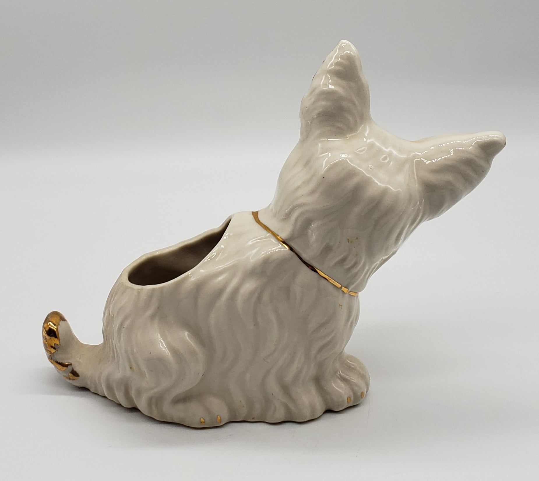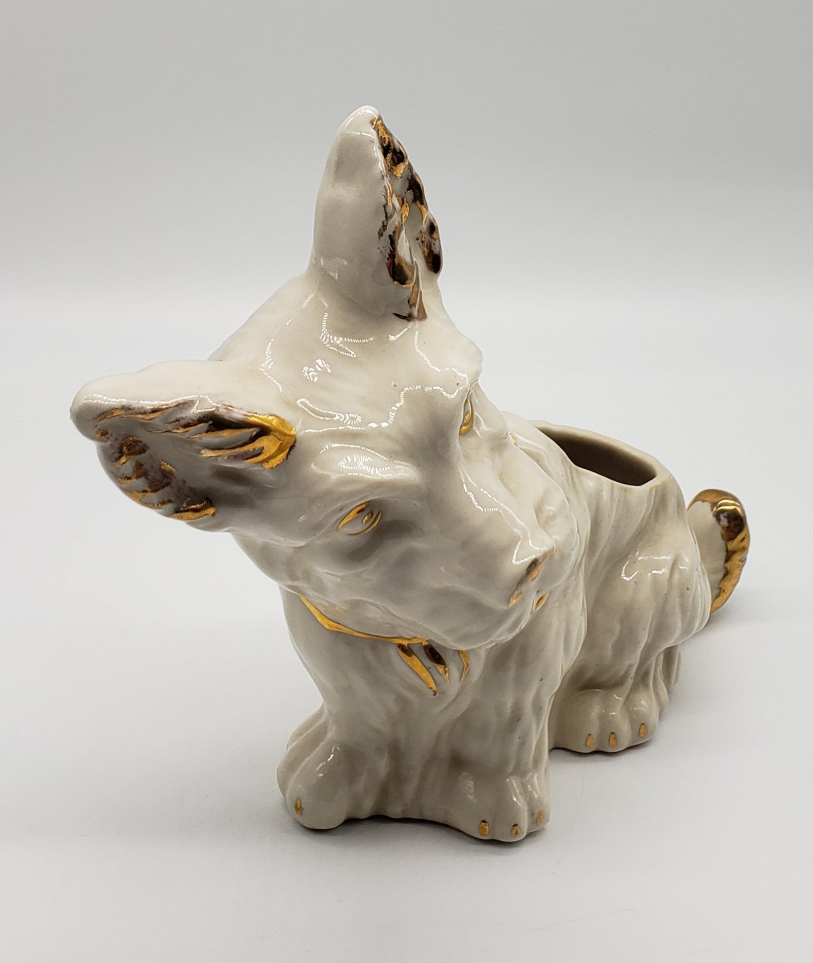 Vintage White Ceramic Terrier Scottie Scotty Dog Planter Gold Trim