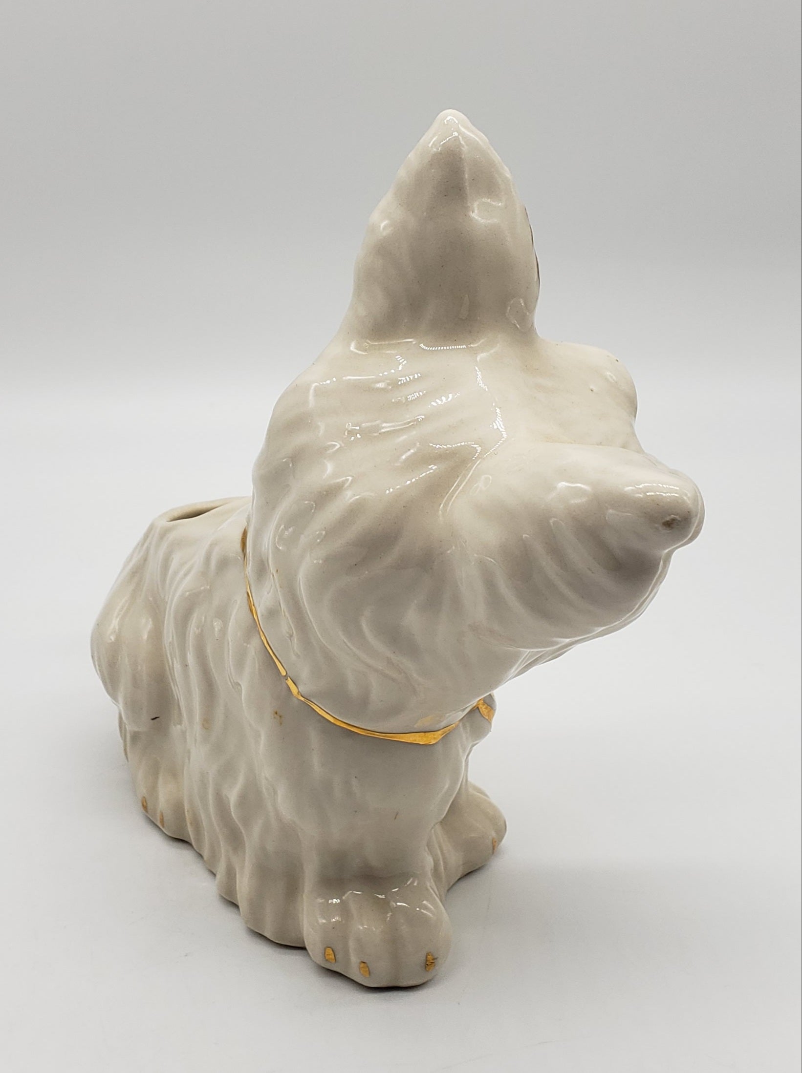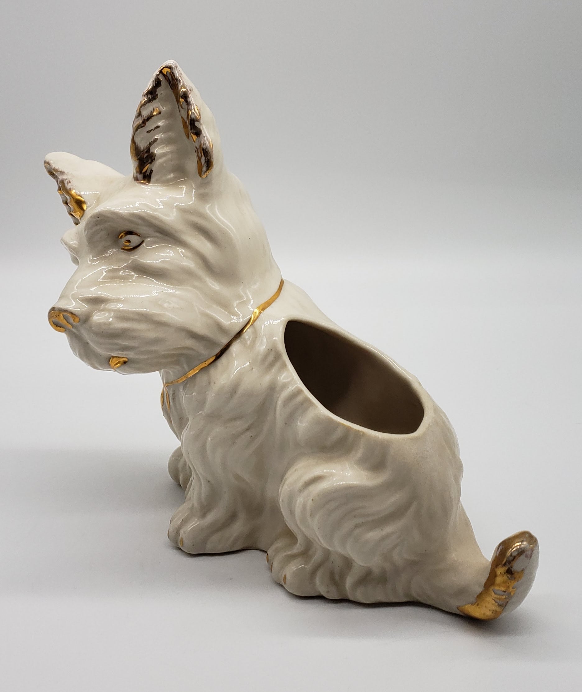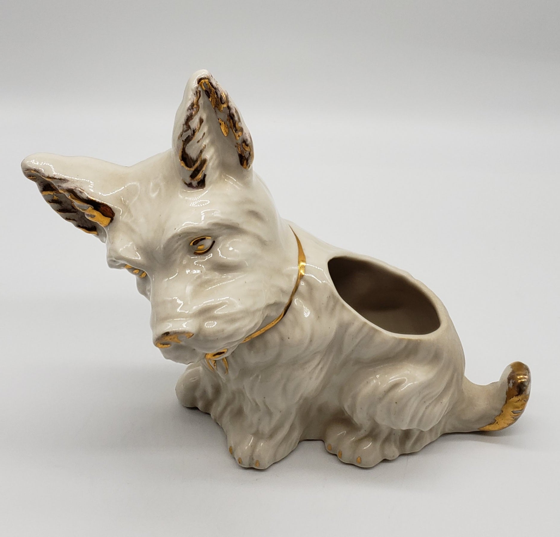 Vintage White Ceramic Terrier Scottie Scotty Dog Planter Gold Trim