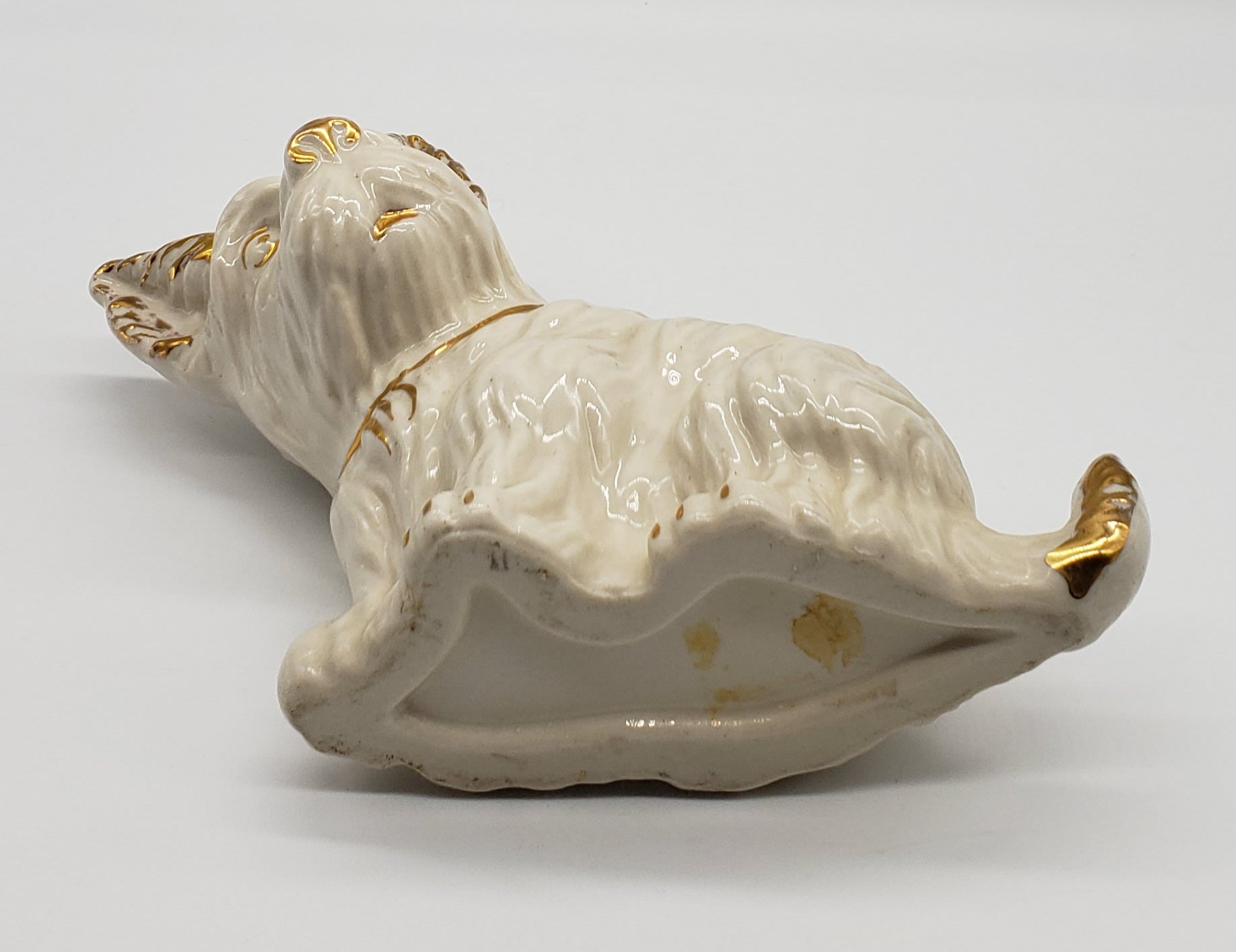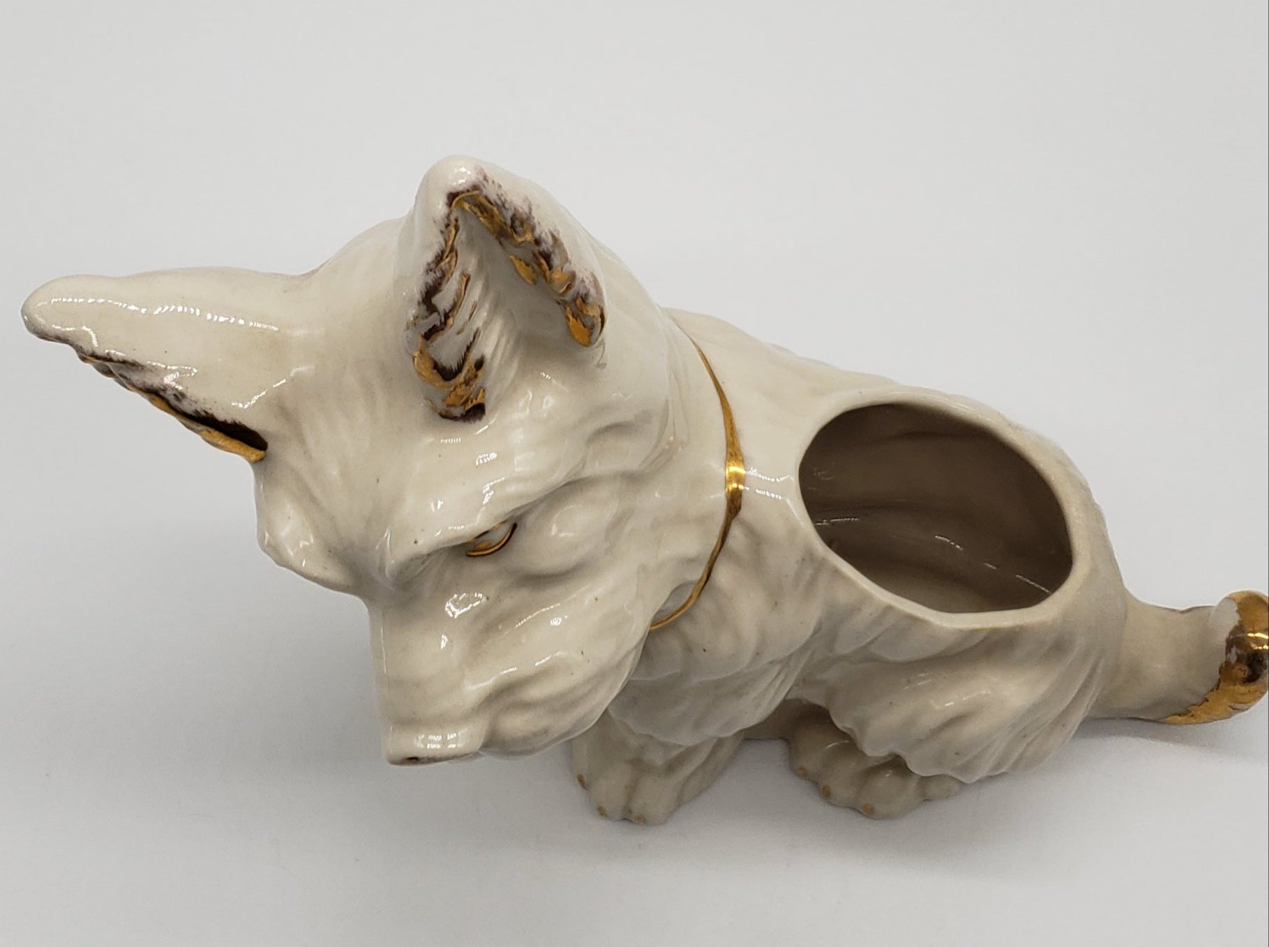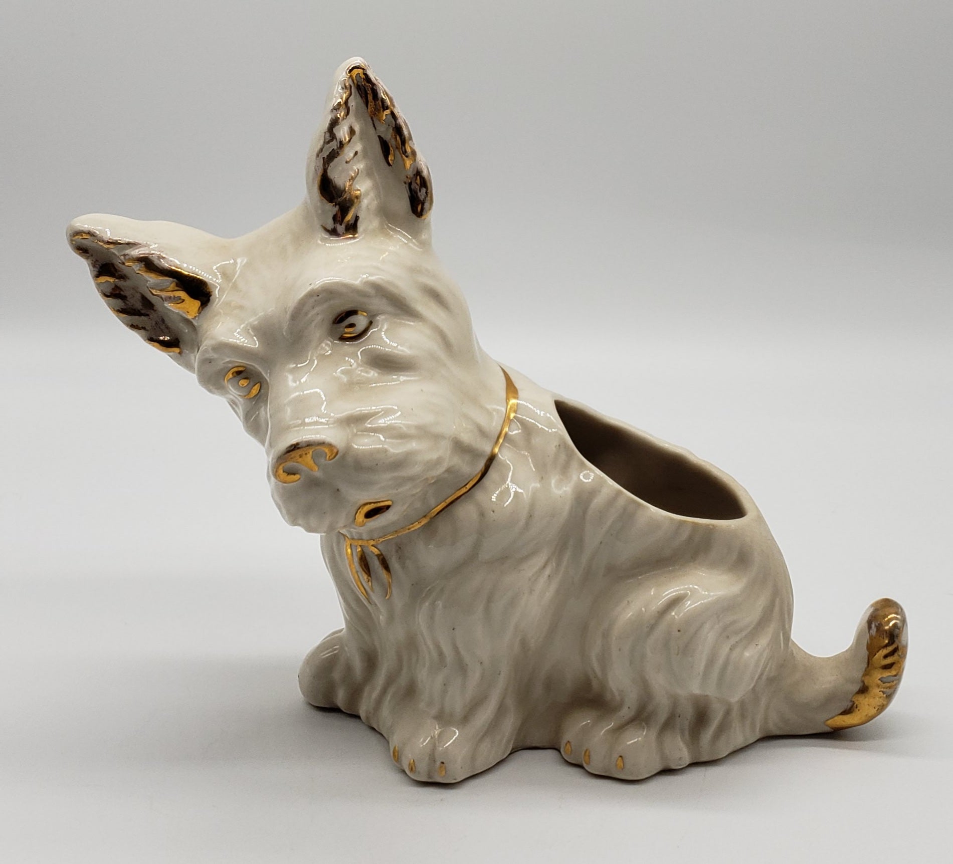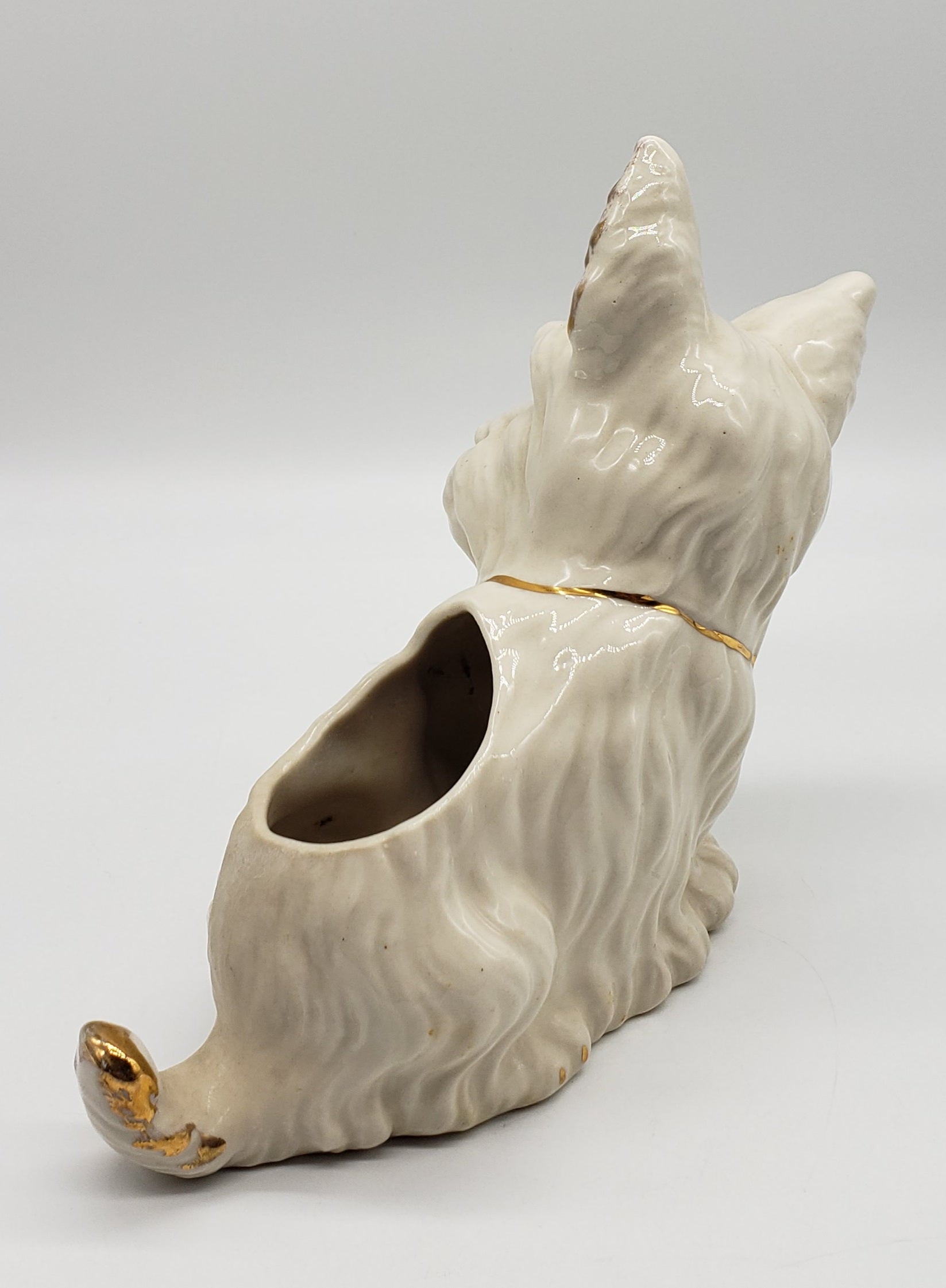 Vintage White Ceramic Terrier Scottie Scotty Dog Planter Gold Trim